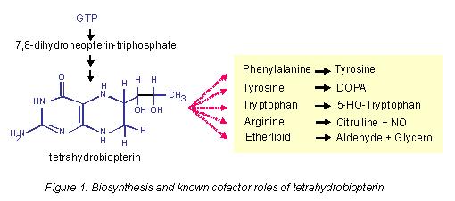 5,6,7,8-Tetrahydrobiopterin (H4biopterin) is a compound related to the vitamins folic acid and riboflavin which are all characterised by the common pteridine heterocycle. In contrast to folic acid and riboflavin, however, mammals (including humans) synthesise H4biopterin from guanosine triphosphate (GTP). H4-biopterin is a cofactor for hydroxylating aromatic amino acids – and is hence of crucial importance for neurotransmitter formation –, for nitric oxide (NO) formation from L-arginine – a key molecule for neurotransmission, blood pressure regulation and immune function –, and for glycerylether monooxygenase – a little studied enzyme with unknown sequence (Figure 1).