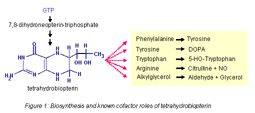 Neopterin is a product of human monocyte-derived macrophages (1) and dendritic cells(2) formed preferentially in response to interferon-γ but also to some other pro-inflammatory stimuli. It stems from 7,8-dihydroneopterin-triphosphate, a metabolite in the formation of 5,6,7,8-tetrahydrobiopterin (H4-biopterin) from GTP. H4-biopterin is a cofactor for hydroxylating aromatic amino acids – and is hence of crucial importance for neurotransmitter formation –, for nitric oxide (NO) formation from L-arginine – a key molecule for neurotransmission, blood pressure regulation and immune function –, and for alkylglycerol (glyceryl-ether) monooxygenase (Figure 1).