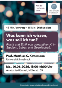 Im Rahmen der Vortragsreihe „KI in der Hochschulpraxis“ werden ausgewählte Aspekte der Künstlichen Intelligenz für unsere Hochschule, Forschung, Lehre und Verwaltung anwendungsnah vorgestellt und diskutiert.