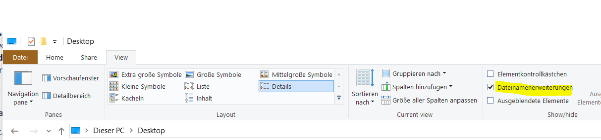 Um die vollständige Dateinamenerweiterung anzuzeigen, aktivieren Sie diese im Explorer unter dem Reiter „Ansicht“, indem Sie das Kästchen bei „Dateinamenerweiterung“ ankreuzen.
