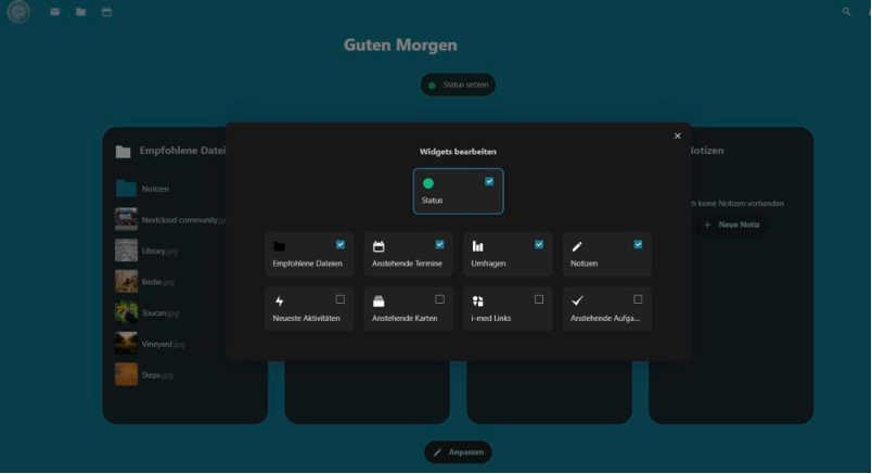 Wir empfehlen, folgende Widgets für die Anzeige im Dashboard auszuwählen: