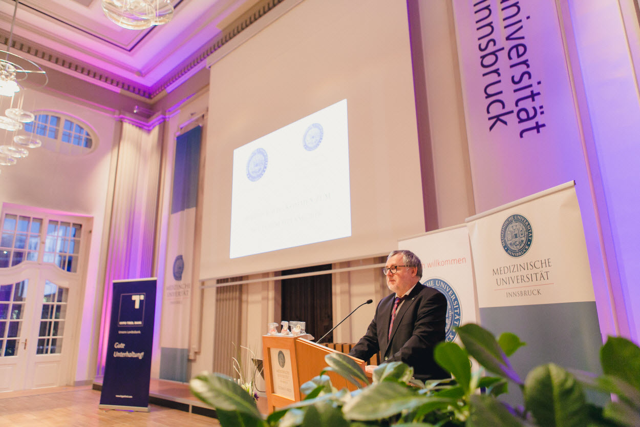 Auch Innsbrucks Vizebürgermeister Franz Xaver Gruber und Christian J. Wiedermann, Geschäftsführer der Tirol Kliniken, drückten in ihren Grußworten ihre Verbundenheit zur Medizinischen Universität Innsbruck aus. Ehrende Worte für Jubilare und Mitarbeiter:innen, die im vergangenen Jahr in den Ruhestand traten, fand Vizerektorin Christine Bandtlow.