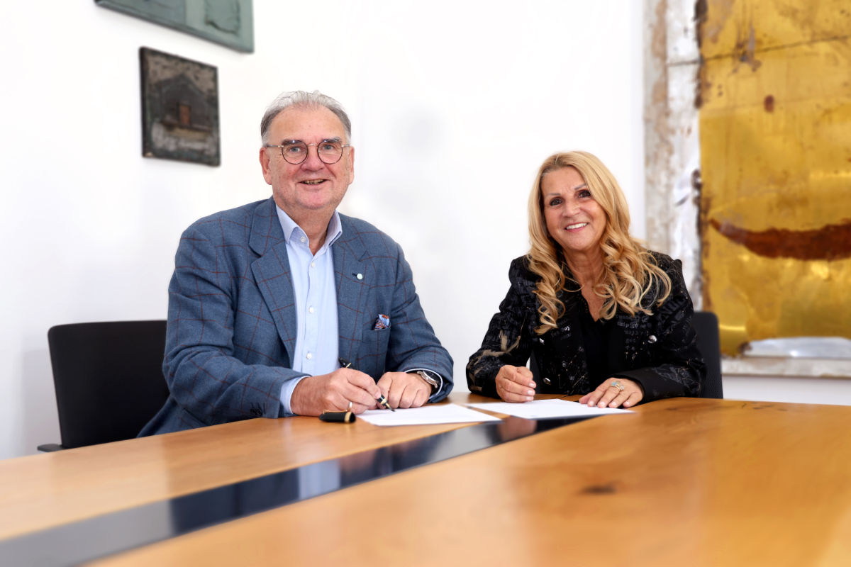 Rektor Wolfgang Fleischhacker und Ursula Mattersberger, Obfrau der Kinder-Krebs Hilfe Tirol und Vorarlberg und Präsidentin der Österreichischen Kinder-Krebs-Hilfe, bei der Unterzeichnung des Spendenvertrags. (Foto: MUI/D. Bullock)