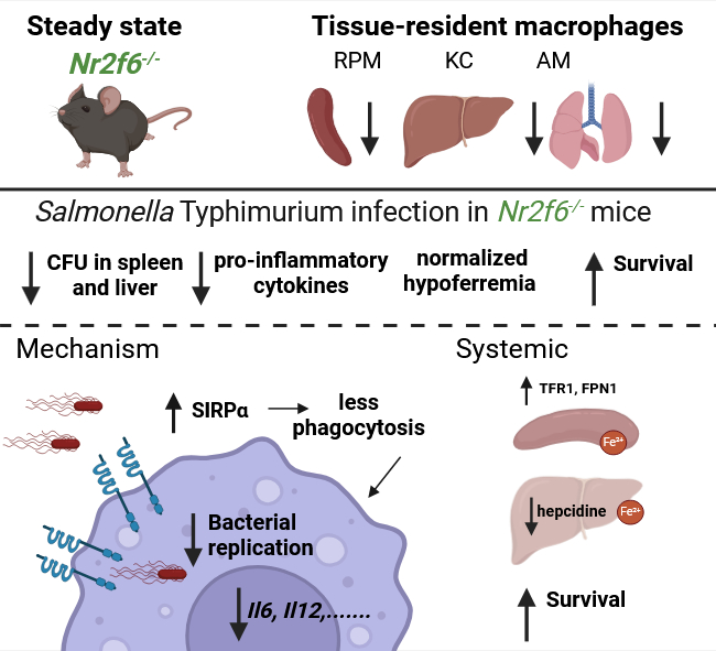 In den anschließenden Infektionsversuchen produzierten die Nr2f6-/--Mäuse weniger entzündungsfördernde Zytokine, wiesen eine geringere Bakterienlast auf und zeigten insgesamt eine abgeschwächte Aktivierung des Immunsystems. Salmonellen nutzen normalerweise Makrophagen als Rückzugsort aus und werden von ihnen im Körper weitertransportiert. Dabei profitieren sie vom dort gespeicherten Eisen, das sie für ihr Wachstum benötigen. Der Körper versucht im Infekt zwar, verfügbares extrazelluläres Eisen zu reduzieren, doch dadurch steigt gerade in Makrophagen die Eisenkonzentration. Das Team fand Hinweise darauf, dass NR2F6 diesen Eisenstoffwechsel während der Salmonelleninfektion mittels Makrophagen reguliert.