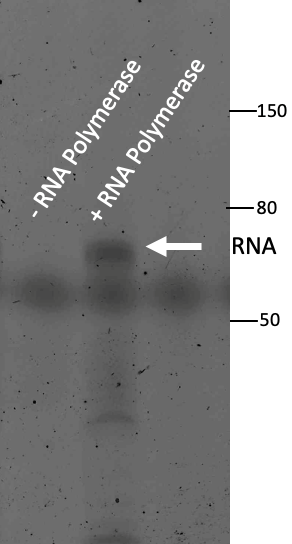 Foto: mittels einer RNA basierten RNA Polymerase (+ RNA Polymerase) wurde eine weitere katalytisch aktive RNA im Reagenzglas synthetisiert , ein sogenanntes Hammer-Head Ribozym (weißer Pfeil), das in der Lage ist andere RNA Moleküle zu schneiden.
