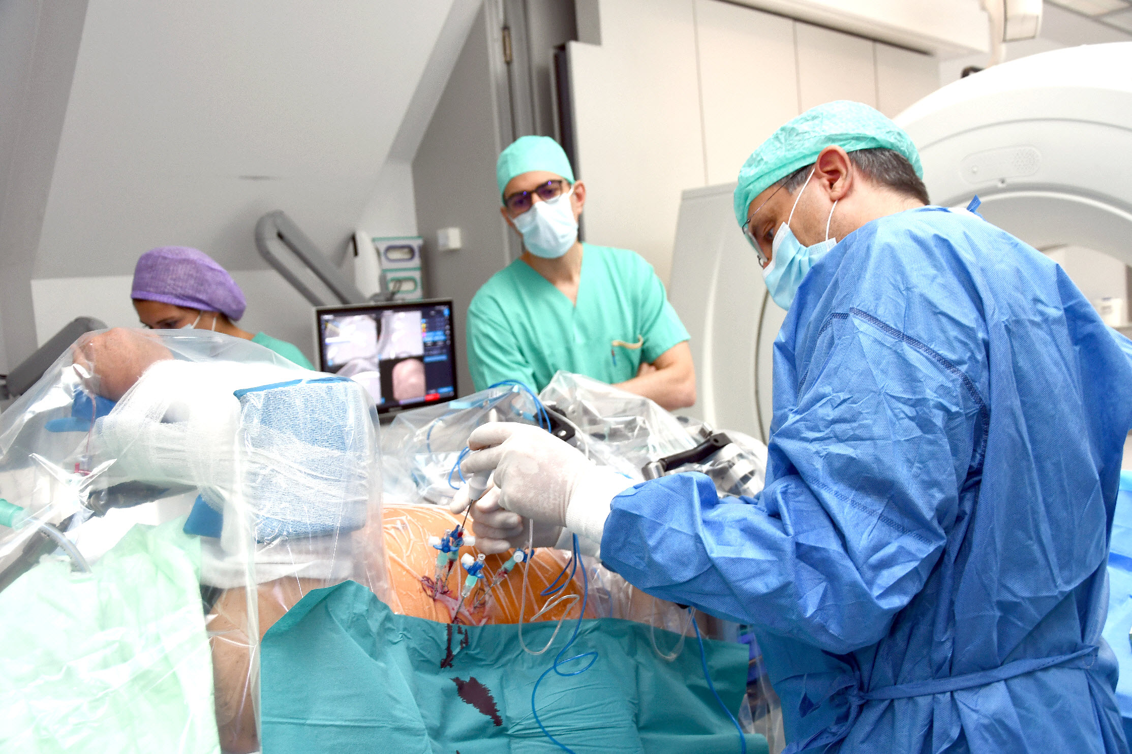 Bei der herkömmlichen Radiofrequenzablation, die auf dem Prinzip der Hitzeschädigung von Tumorgewebe beruht, wird lediglich eine einzelne Nadel gesetzt. Bei der sRFA kommt hingegen eine von Reto Bale, leitender Oberarzt für Interventionelle Onkologie – Mikroinvasive Therapie (SIP) an der Universitätsklinik für Radiologie (interim. Direktorin: Elke Gizewski), bereits in seiner Studienzeit entwickelte Zielvorrichtung und ein inzwischen erfolgreich optimiertes neurochirurgisches 3D-Navigationssystem zum Einsatz. Auf diese Weise können gleich mehrere Nadeln platziert und damit auch große und zahlreiche Tumore erfasst werden. Die minimalinvasive radiologische Behandlung ermöglicht eine effektive und punktgenaue Tumorzerstörung. „Die Nadeln werden so im Tumor eingebracht, dass die durch die Hitze erzeugten Ablationszonen das Krebsgewebe komplett überdecken. Die Gelenke der Zielvorrichtung werden dabei so lange verändert, bis am Bildschirm drei Kreise deckungsgleich übereinanderliegen. Durch hohle Koaxialnadeln – das präzise Setzen dieser Nadeln wird vor dem Eingriff minutiös an dreidimensionalen Datensätzen geplant und mittels CT kontrolliert – werden schließlich die eigentlichen Radiofrequenzsonden eingeführt.