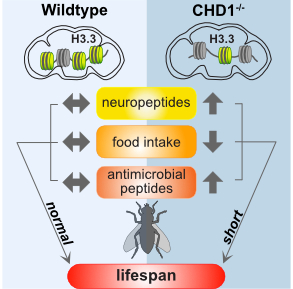 In ihren Untersuchungen mit Drosophila haben die Wissenschaftler:innen nun festgestellt, dass der Anteil der Histonvariante H3.3 im Gehirn stark reduziert ist, wenn CHD1 fehlt. Die Transkription im Gehirn gerät außer Kontrolle: „Ein Großteil der Gene wird hochreguliert, es werden mehr Gene transkribiert als normal. Durch das fehlende H3.3 wird Chromatin nicht mehr so dicht gewickelt und Genorte, die nicht transkribiert werden sollten, werden transkribiert. Gene, die bereits abgelesen werden, werden stärker abgelesen. Darunter sind viele Neuropeptide, die Hunger und Sättigung regulieren sowie antimikrobielle Peptide, die einen Teil des Immunsystems ausmachen, was zur Folge hat, dass sich die Fliege in einem konstanten Entzündungszustand befindet “, erläutert Lusser den Vorgang. Interessant: „Wenn man CHD1 wieder nur ins Gehirn einführt, werden alle Defekte behoben und die Fliegen haben eine ganz normale Lebenszeit. Das Protein wird in allen Zellen gebildet. Es kann überall fehlen, nur nicht im Gehirn. Dann geht es der Fliege gut.“