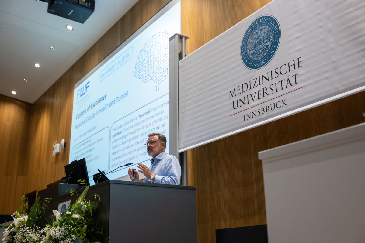 Ein musikalisches Duo eröffnete eröffnete die Feierstunde im Audimax der Med Uni Innsbruck, anschließend begrüßte Rektor Wolfgang Fleischhacker die sechs Habilitand:innen und alle Gäste. Francesco Ferraguti, Direktor des Instituts für Pharmakologie, hielt einen Impulsvortrag zum Thema „Was ist das Ziel des Cluster of Excellence: Neuronal Circuit in Health and Disease?“