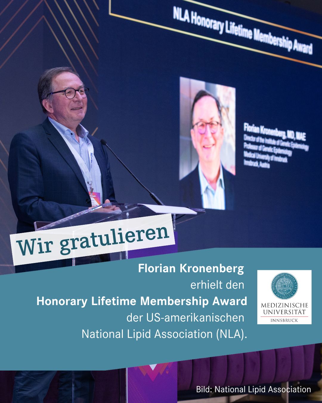 Das Institut für Genetische Epidemiologie in Innsbruck gehört zu den weltweit führenden Einrichtungen für Lp(a)-Forschung. Dieses Renommee ist Direktor Florian Kronenberg zu verdanken, der die Forschung auf diesem Gebiet mit seinen Kolleg:innen in den vergangenen 30 Jahren massiv vorangetrieben hat. Für sein Engagement hat der aus Oberösterreich stammende Mediziner und Wissenschafter zahlreiche Preise und Auszeichnungen erhalten. Zuletzt honorierte ihn im Juni 2024 die einflussreiche US-amerikanische National Lipid Association (NLA) mit der Ehrenmitgliedschaft auf Lebenszeit. In der Liste der Ehrenmitglieder der letzten 15 Jahre finden sich sehr bekannte Vertreter der Lipidforschung. In der Laudatio wurden die wichtigen Beiträge erwähnt, die Kronenberg und sein Team für das Feld geleistet haben. Besonders hervorgehoben wurde das 2022 publizierte Lp(a) Konsensuspaper der European Atherosclerosis Society, für welches Kronenberg den Vorsitz hatte. „Die National Lipid Association hat nun wesentlich durch unser Consensus Paper getriggert deren Richtlinie geändert und ist nun auf Linie mit unseren Empfehlungen“, sagt Kronenberg.