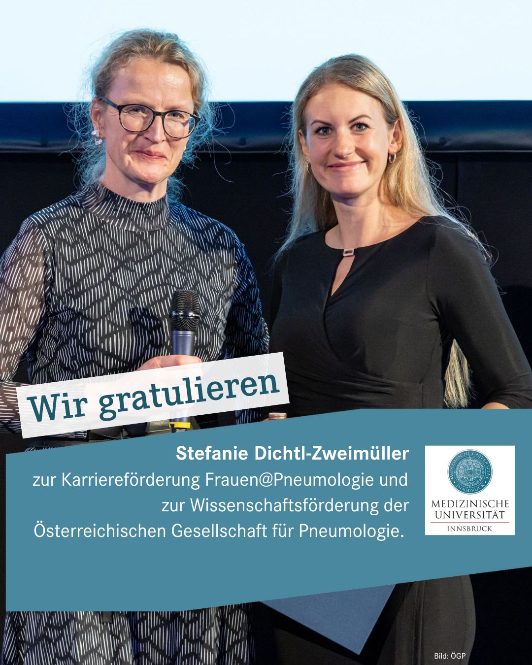 Stefanie Dichtl-Zweimüller, Forscherin am Institut für Hygiene und Medizinische Mikrobiologie, hat doppelten Grund zur Freude. Gleich zwei ihrer Arbeiten wurden von der Österreichischen Gesellschaft für Pneumologie (ÖGP) mit Preisen bedacht. Ihr Projekt „Iron: The Trojan horse of respiratory infections?“ wurde mit der Karriereförderung Frauen@Pneumologie ausgezeichnet. In dieser Arbeit untersucht sie in einem 3D Model von primären humanen bronchialen Epithelzellen den Einfluss des Eisenstoffwechsels während einer Influenza bzw. RSV Infektion. Mit der ÖGP Wissenschaftsförderung wurde außerdem auch ihr Projekt „The role of ferroptosis in COPD under hypoxia“ unterstützt, in dem sie in primären humanen Epithelzellen in Anwesenheit von Immunzellen den Einfluss eines speziellen eisenabhängigen Zelltodes, Ferroptosis, unter Sauerstoffmangel erforscht. Pneumologin und ÖGP-Generalsekretärin Judith Löffler-Ragg (li.) übergab die Auszeichnung. Wir gratulieren!