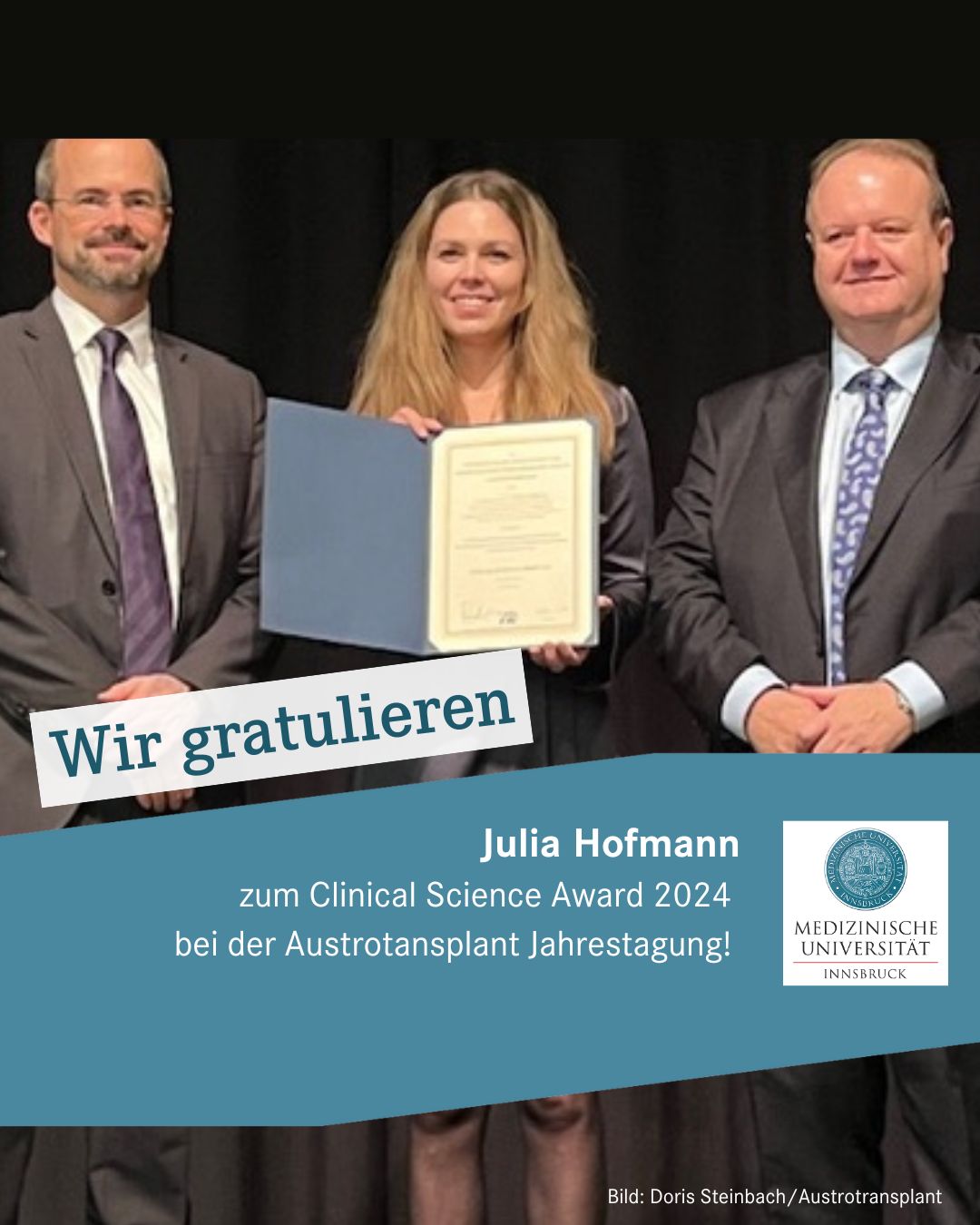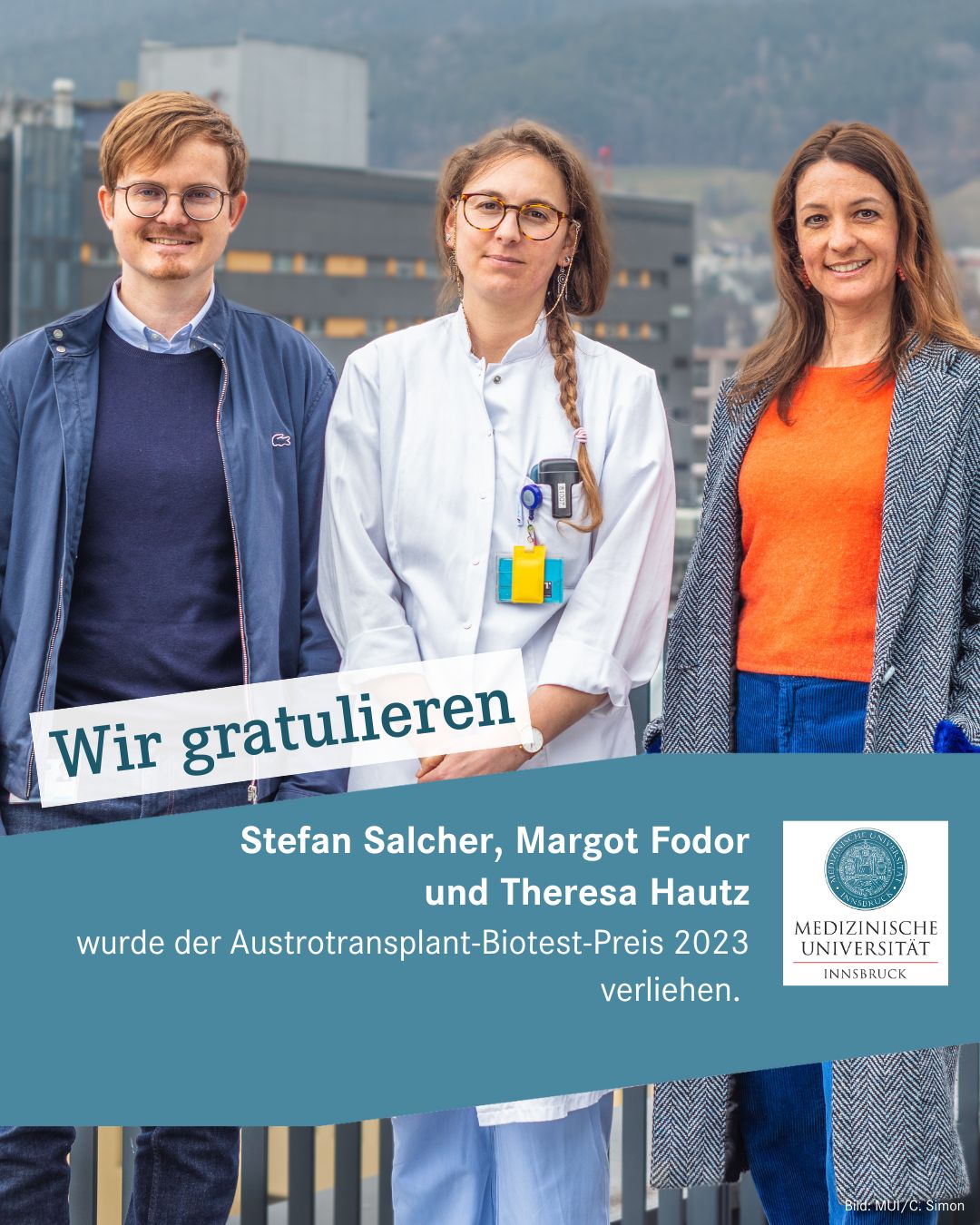 Beim Austrotransplant Kongress 2023 wurde die Arbeit „Immune cell dynamics deconvoluted by single-cell RNA sequencing in normothermic machine perfusion of the liver“, kürzlich erschienen in Nature Communications, mit dem Austrotransplant-Biotest-Preis 2023 ausgezeichnet. Die Erstautor:innen Theresa Hautz und Margot Fodor (aus dem Team um Direktor Stefan Schneeberger von der Universitätsklinik für Visceral-, Transplantations- und Thoraxchirurgie, organLife) sowie Stefan Salcher (Universitätsklinik für Innere Medizin V, Direktor Dominik Wolf) haben in ihrer Arbeit gezeigt, wie schnell und zahlreich Immunzellen der Leber aktiviert und umverteilt werden, während diese außerhalb des Körpers an einer Maschine durchblutet und für die Transplantation vorbereitet wird. Theresa Hautz nahm den von der Österreichischen Gesellschaft für Transplantation, Transfusion und Genetik verliehenen Preis beim Austrotransplant 2023 in Eisenstadt entgegen. Wir gratulieren! Mehr Infos: https://www.i-med.ac.at/mypoint/news/771889.html