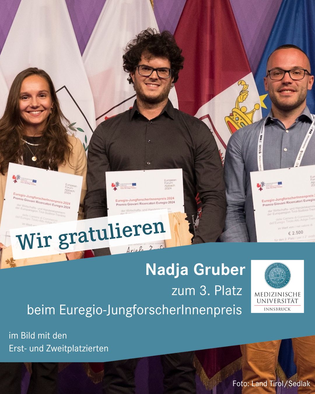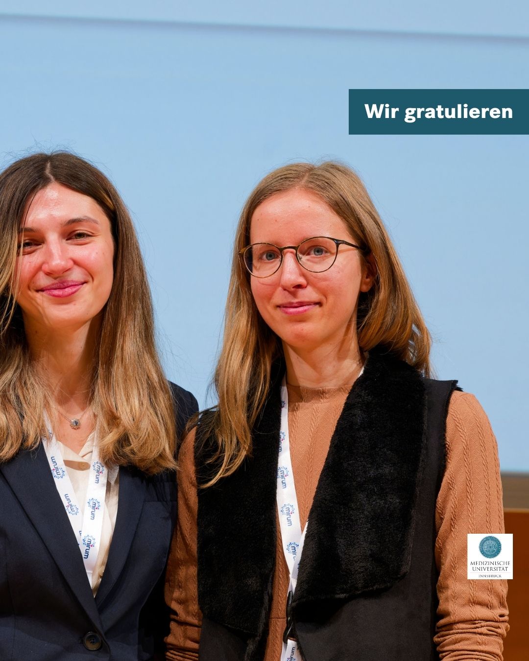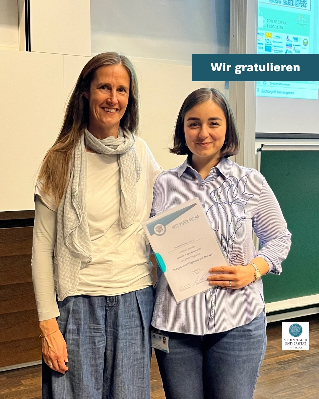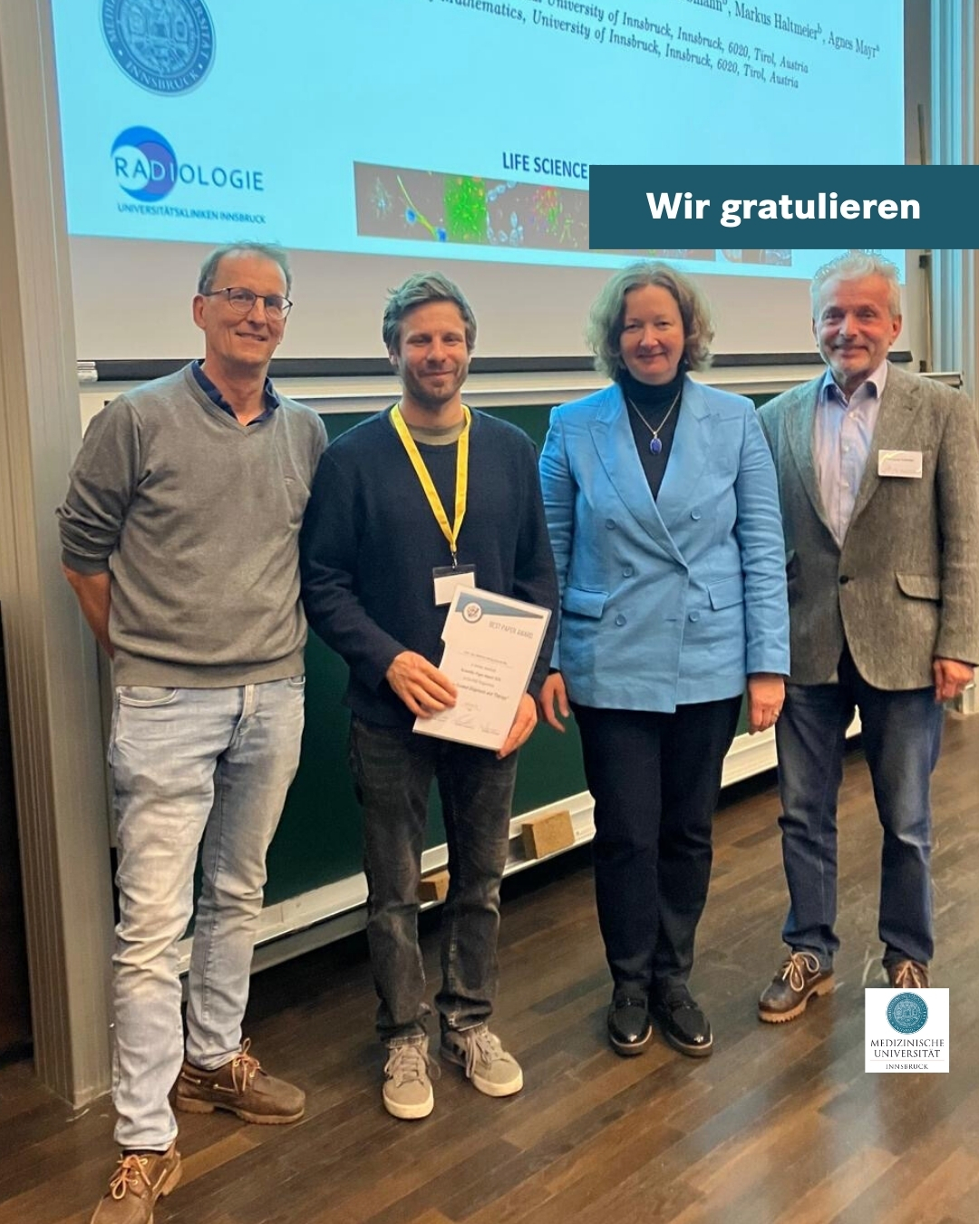 Beim „Life Science PhD Meeting Innsbruck“ im April 2024 wurden mehrere Preise an Studierende verliehen. Maria Kompatscher (Institut für Genomik and RNomik) und Deborah Minzaghi (Univ.-Klinik für Dermatologie, Venerologie und Allergologie) erhielten ex aequo den ersten Preis in der Kategorie MCBD Best Paper Award. Mia Kvåle Løvmo (Institut für Biomedizinische Physik) erhielt den Scientific Paper Award des PhD-Programms „Image-Guided Diagnosis and Therapy (IGDT). Sadegh Rashimi (Institut für Pharmakologie) und Katharina Steiner (Univ.-Klinik für Psychiatrie I) bekamen ex aequo den Neuroscience Best Paper Award. Victoria Halim (Institut für Physiologie) und Felix Eichin (Institut für Entwicklungsimmunologie) erhielten den Best Talk Award, Isabel Singer (Institut für Zellbiologie) und Martin Heiss (Institut für Physiologie) wurden mit dem Best Poster Award ausgezeichnet. Marlene Lochner (Institut für Entwicklungsimmunologie) schließlich bekam den Microscopy Award überreicht. Wir gratulieren!