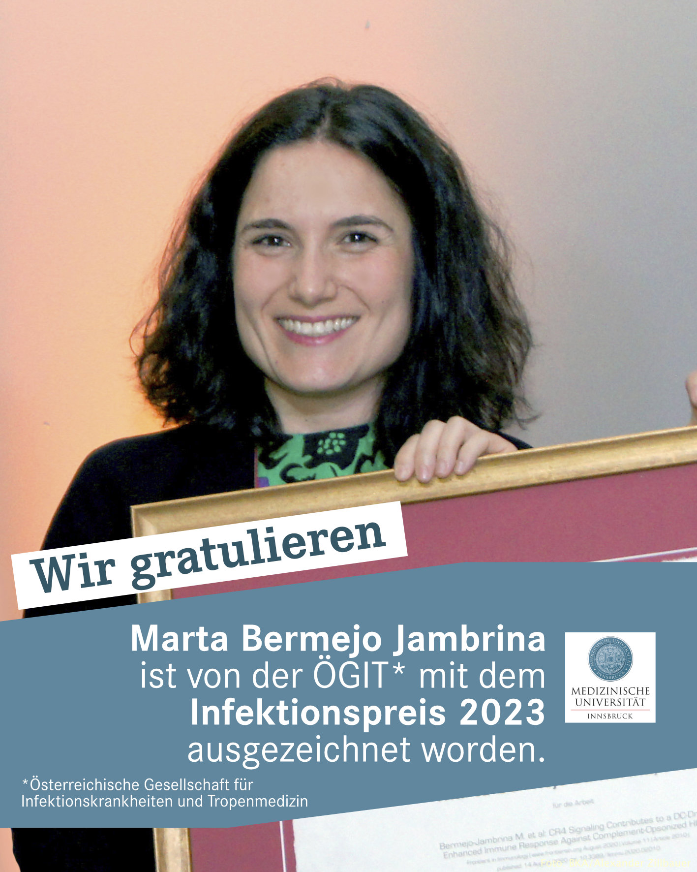 In der HIV-Therapieforschung fokussiert sich Marta Bermejo Jambrina, ÖAW Postdoc am Institut für Hygiene und Medizinische Mikrobiologie, auf die Wechselwirkungen von opsonisierten und nicht-opsonisierten Krankheitserregern (dh vom Komplementsystem markierten und nicht markierten Krankheitserregern) mit Immunzellen. Für ihre Arbeit CR4 Signaling Contributes to a DC-Driven Enhanced Immune Response Against Complement-Opsonized HIV-1, die im Fachjournal Frontiers in Immunology publiziert wurde, hat sie nun den Infektionspreis 2023 erhalten.