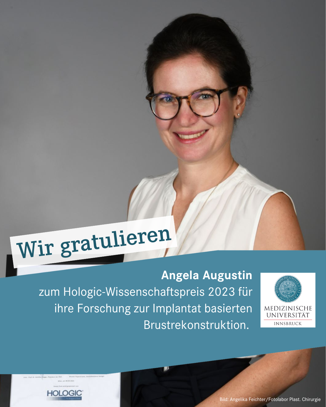 Die Österreichische Gesellschaft für Senologie (ÖGS) hat auch dieses Jahr wieder ihren vom Medizintechnikunternehmen Hologic gestifteten Wissenschaftspreis als Ehrung für die Fortschritte bei der Brustkrebstherapie und für außerordentliche Forschung zur Verbesserung der Mamma Karzinom Früherkennung ausgeschrieben. Angela Augustin zählt mit ihrer Publikation: Is it all about surface topography? An intraindividual clinical outcome analysis of two different implant surfaces in breast reconstruction (J Clin Med. 2023) zu den diesjährigen Preisträger:innen. Die feierliche Überreichung erfolgte im Rahmen der 37. Jahrestagung der Österreichischen Gesellschaft für Senologie, die von 8. bis 9.9. 2023 in Wien über die Bühne ging.