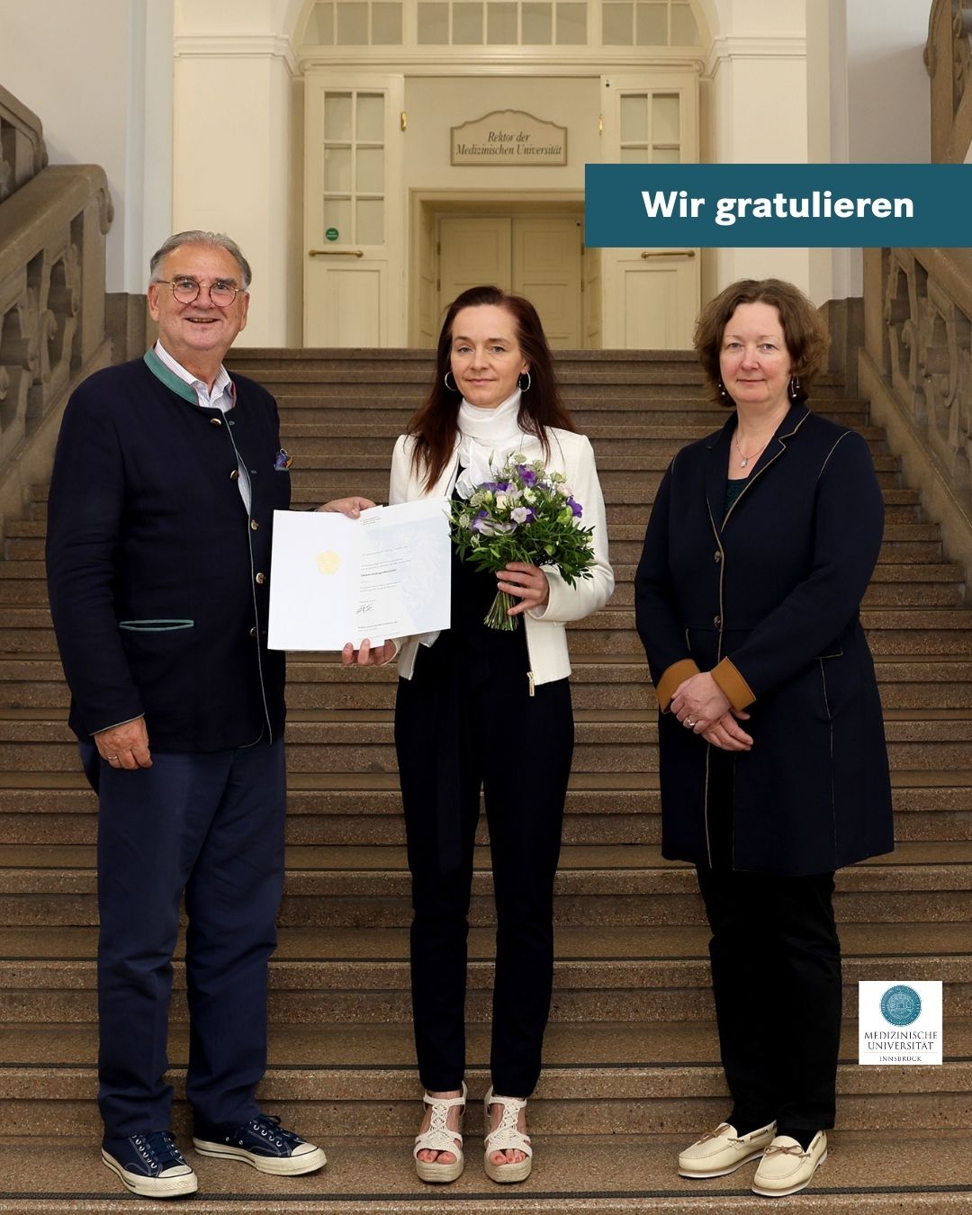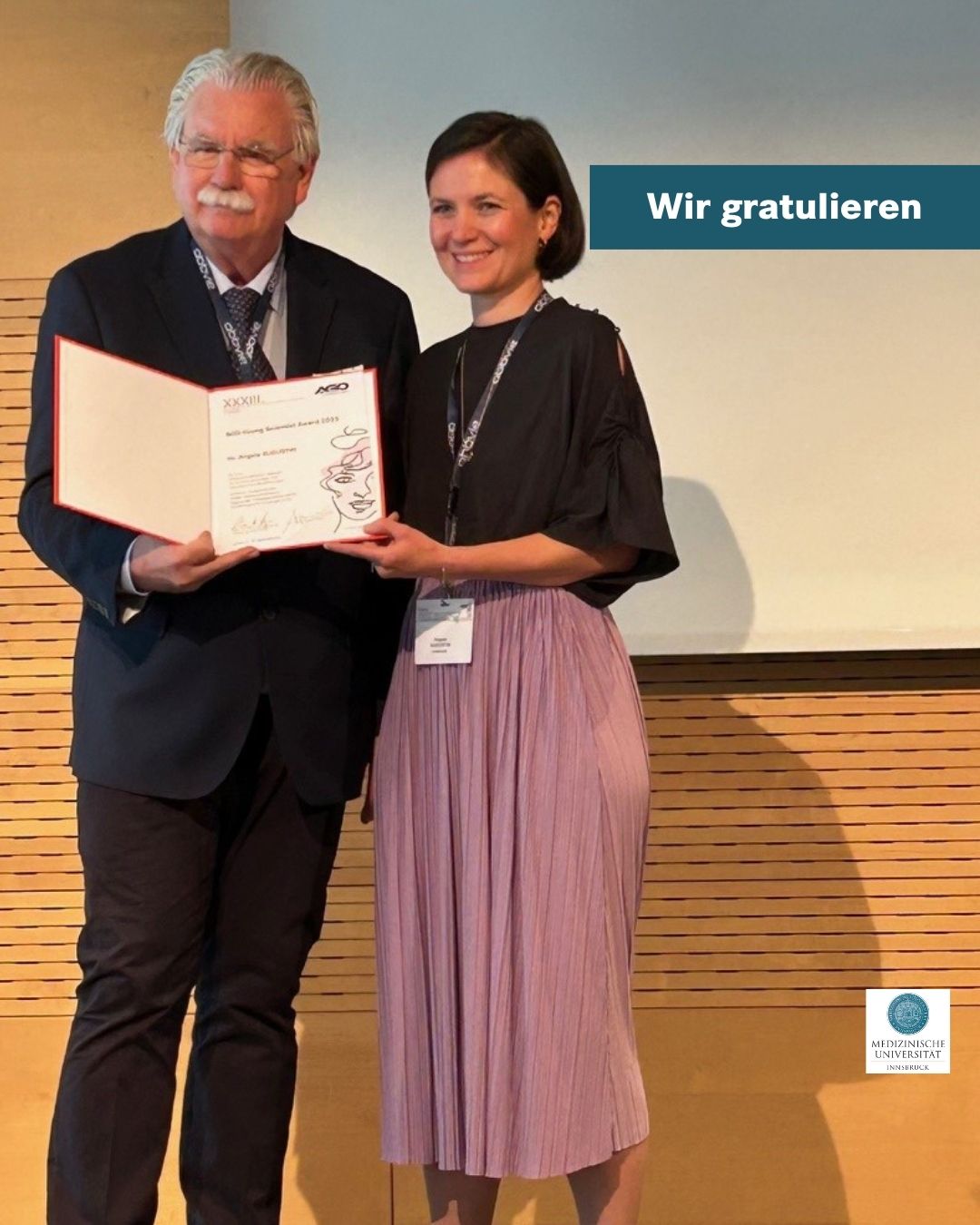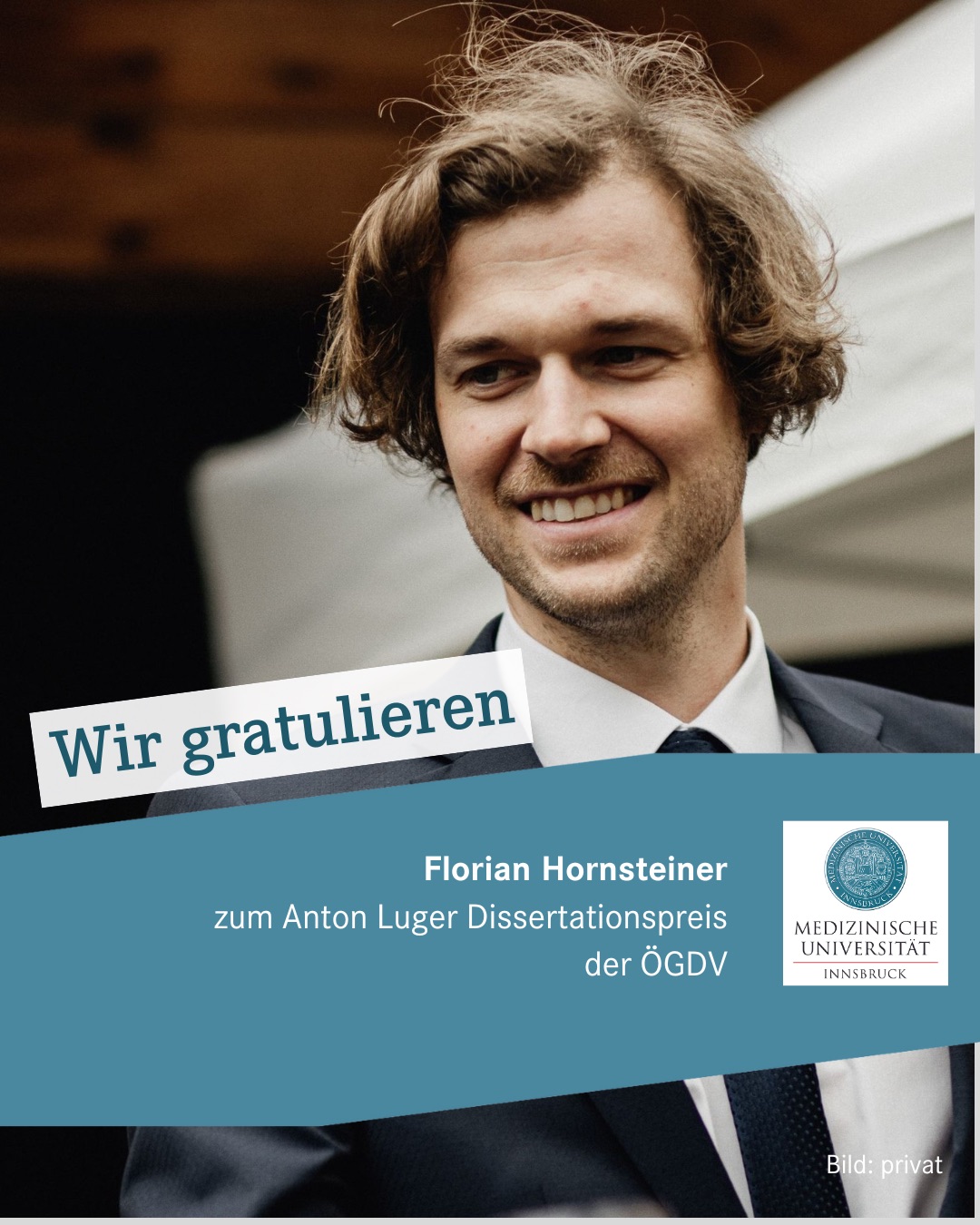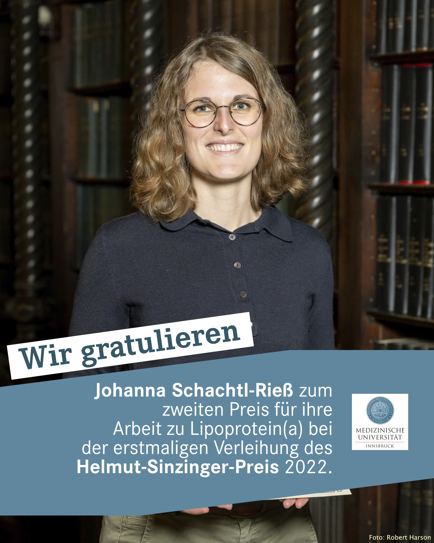 Johanna F. Schachtl-Rieß (Institut für Genetische Epidemiologie, Direktor Florian Kronenberg) hat beim Wilhelm-Auerswald-Preis für die beste Dissertation an einer österreichischen Medizinischen Universität den 3. Platz belegt. Der Preis wird jedes Jahr von der Gesellschaft der Ärzte in Wien verliehen, um exzellente medizinische Forschung und akademische Leistungen zu würdigen. Schachtl-Rieß befasste sich in ihrer Forschungsarbeit mit dem am Institut für Genetische Epidemiologie viel beforschten Blutfett Lipoprotein(a) und dessen kausaler Rolle bei Koronarer Herzkrankheit (KHK) und der genetischen Grundlage der Cholesterin Efflux Kapazität von HDL Partikeln, einem weiteren Risikofaktor für KHK. Wir gratulieren!