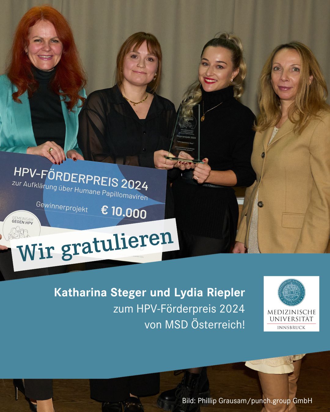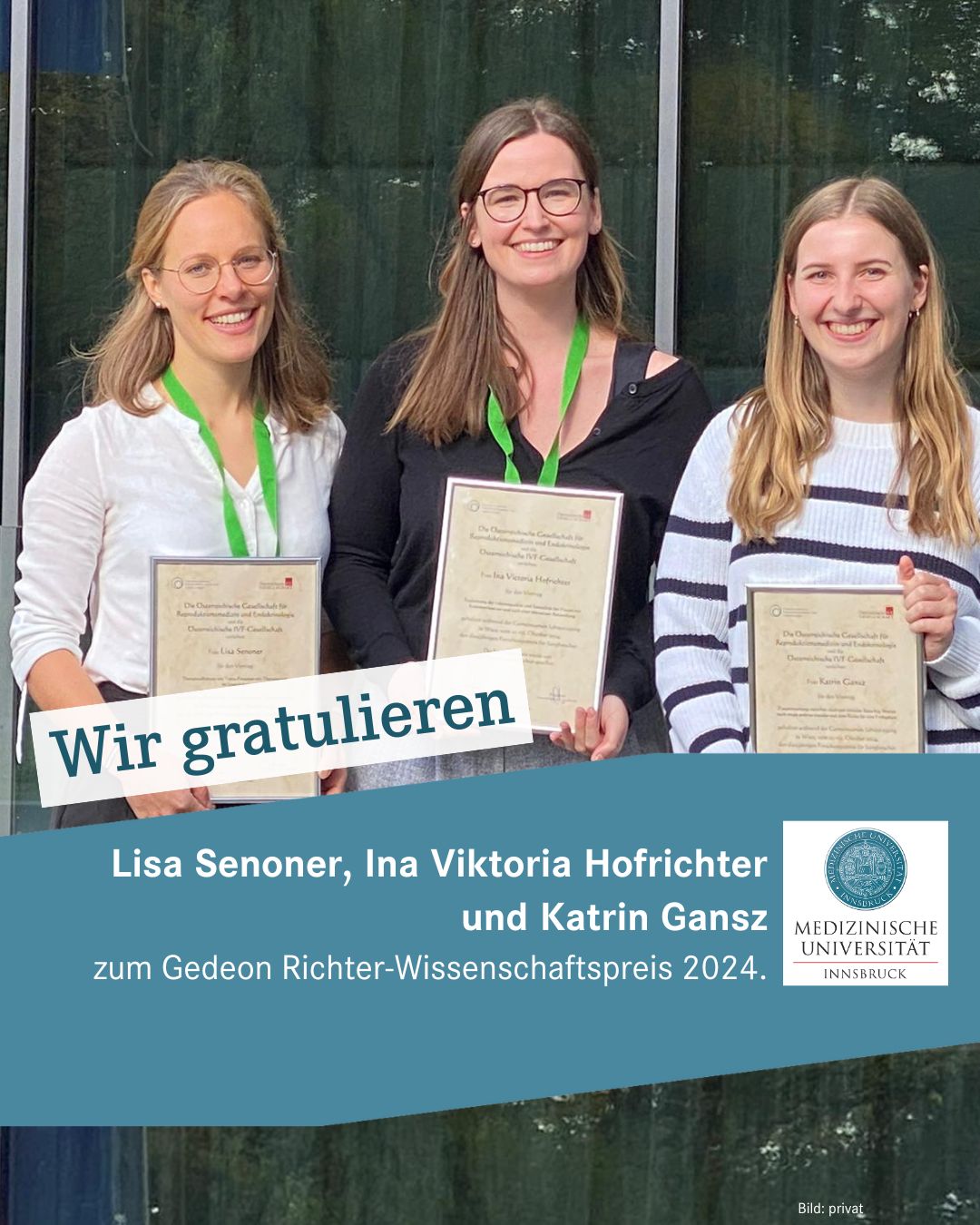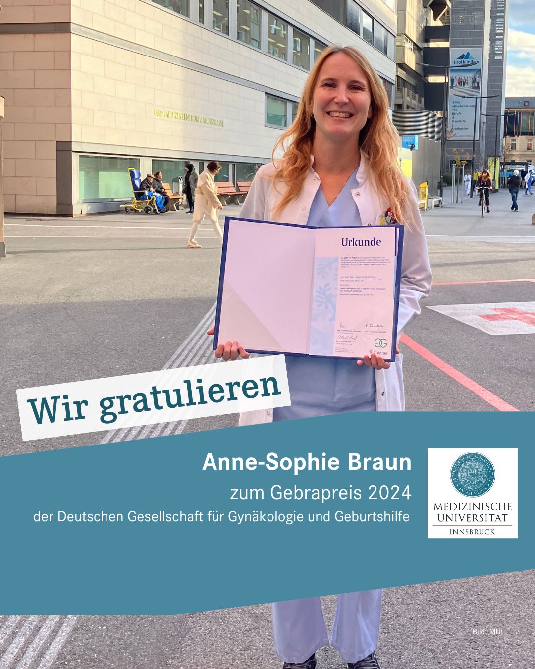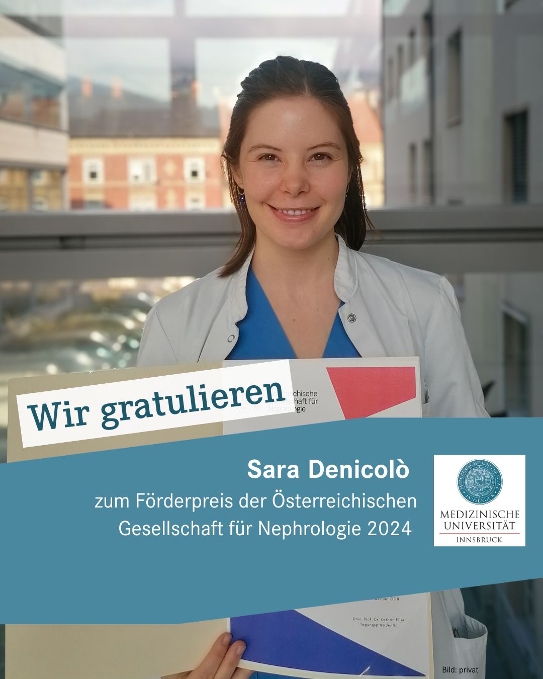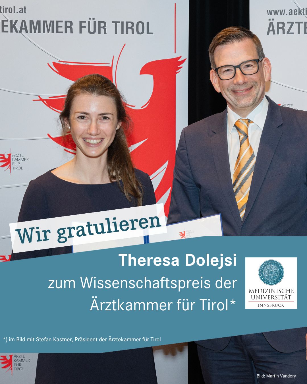 Johanna F. Schachtl-Rieß (Institut für Genetische Epidemiologie, Direktor Florian Kronenberg) hat beim Wilhelm-Auerswald-Preis für die beste Dissertation an einer österreichischen Medizinischen Universität den 3. Platz belegt. Der Preis wird jedes Jahr von der Gesellschaft der Ärzte in Wien verliehen, um exzellente medizinische Forschung und akademische Leistungen zu würdigen. Schachtl-Rieß befasste sich in ihrer Forschungsarbeit mit dem am Institut für Genetische Epidemiologie viel beforschten Blutfett Lipoprotein(a) und dessen kausaler Rolle bei Koronarer Herzkrankheit (KHK) und der genetischen Grundlage der Cholesterin Efflux Kapazität von HDL Partikeln, einem weiteren Risikofaktor für KHK. Wir gratulieren!