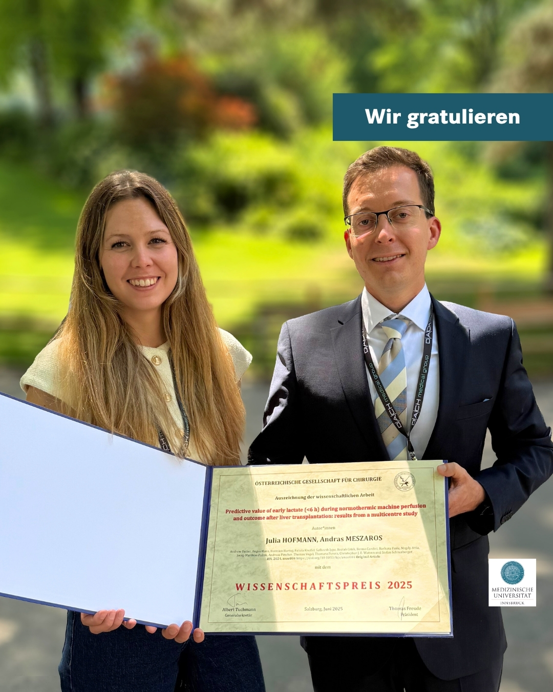 Theresa Hautz wurde der Austrotransplant Biotest Preis 2025 für ihre in eBioMedicine publizierte Arbeit „Transcriptomic signatures during normothermic liver machine perfusion correspond with graft quality and predict the early graft function“ verliehen. In Ihrer prämierten Arbeit ging sie der Frage nach, welche molekularen Vorgänge und Signalwege in einer Spenderleber während der Maschineperfusion aktiviert werden.