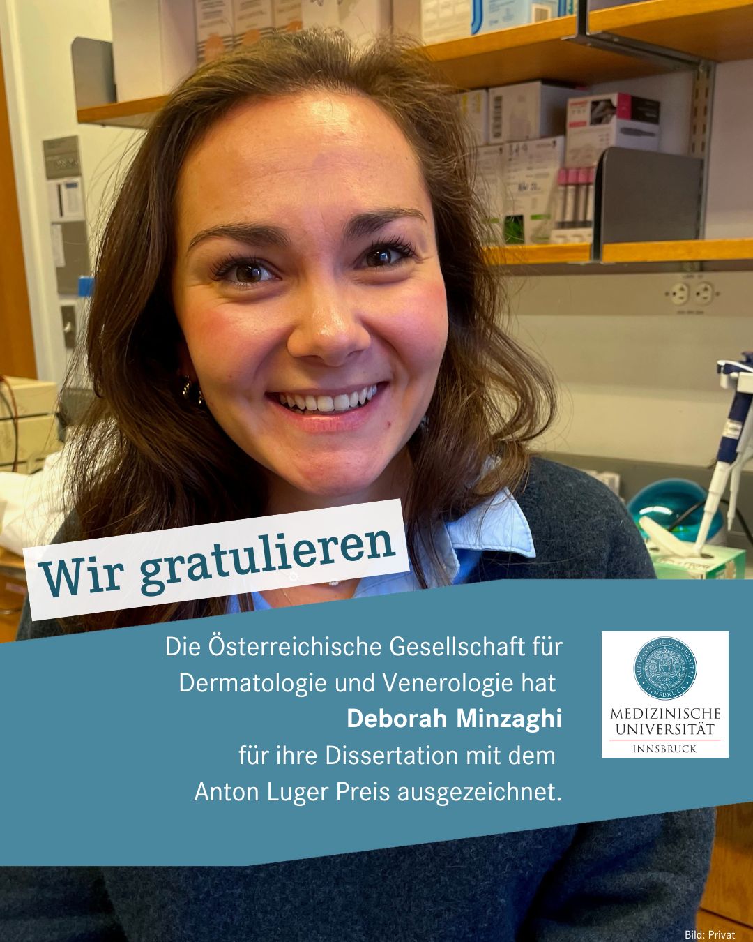 Die Österreichische Gesellschaft für Dermatologie und Venerologie (ÖGDV) hat Deborah Minzaghi vom Labor von Sandrine Dubrac an der Univ.-Klinik für Dermatologie, Venerologie und Allergologie mit dem Anton Luger Preis prämiert. Mit dem Preis, der im Rahmen der Jahrestagung der ÖGDV Anfang Dezember 2023 vergeben wurde, werden hervorragende Dissertationen auf dem Gebiet der experimentellen Dermatologie ausgezeichnet. Deborah Minazghi erhielt den Preis für ihre Arbeit mit dem Titel „The role of environmental triggers in the pathogenesis of atopic dermatitis“. Sie konnte nachweisen, dass topische, endokrine Disruptoren schädliche Auswirkungen – einschließlich oxidativem Stress – auf die Haut haben sowie Veränderungen bewirken, die zur Entwicklung von Neurodermitis beitragen können. Minazghi ist derzeit im Labor von Elizabeth Grice in Philadelphia (University of Pennsylvania) tätig, wo sie daran arbeitet, den Zusammenhang zwischen Umweltfaktoren und Hautkrankheiten weiter zu entziffern.
