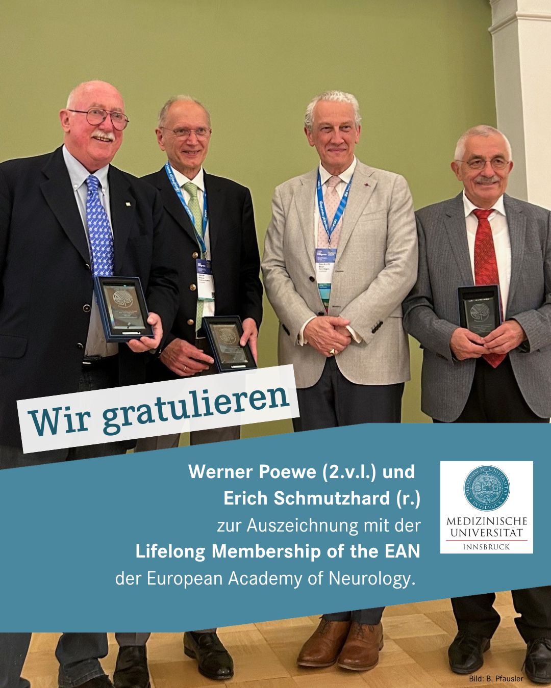 Die European Academy of Neurology (EAN) hat bei ihrem diesjährigen Kongress in Helsinki mit mehr als 9.000 Teilnehmern aus über 100 Ländern erstmals die Auszeichnung einer „Lifelong Membership of the EAN“ an ‚senior professors‘ für besondere Verdienste um die Europäische Neurologie verliehen. Unter den drei Geehrten waren neben Gian-Luigi Lenzi, dem ehemaligen Direktor der Klinik für Neurologie der Universität La Sapienza in Rom, gleich zwei Angehörige der Medizinischen Universität Innsbruck – der ehemalige Direktor der Klinik für Neurologie Werner Poewe und der langjährige Leiter der Intensivstation der Klinik für Neurologie Erich Schmutzhard. Paul Boon, der Präsident der EAN würdigte bei der Verleihung die Verdienste von Werner Poewe um die wissenschaftliche Entwicklung im Bereich der Bewegungsstörungen in der europäischen Neurologie und das unermüdliche Engagement von Erich Schmutzhard innerhalb und ausserhalb der EAN um die Verbesserung der neurologischen Lehre und Ausbildung in Afrika und anderen‚ resource poor countries. Diese Auszeichnungen sind ein weiterer Beleg für das große internationale Ansehen der Univ. Klinik für Neurologie und damit auch des medizinischen Lehr- und Forschungsstandorts Innsbruck in Europa.