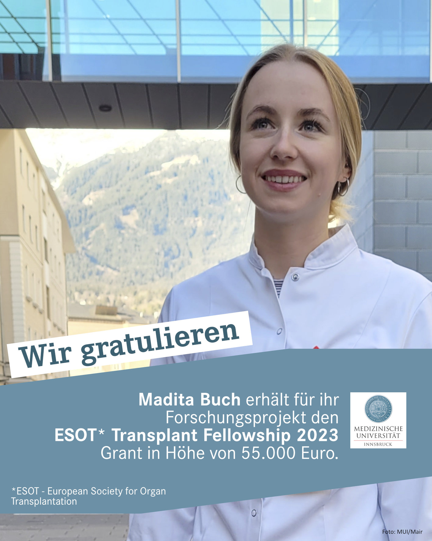 Weltweit werden jährlich circa 30.000 Lebern transplantiert. Bis zu 30 Prozent der Patient:innen entwickeln postoperativ Gallengangskomplikationen, die das langfristige Überleben der Betroffenen beeinflussen. Bisher ist es nicht möglich, die Wahrscheinlichkeit für die Entwicklung einer Gallengangskomplikation vorherzusagen. Die Edinburgh University hat in Zusammenarbeit mit der Medizinischen Universität Innsbruck eine Biosignatur identifiziert, welche ausschließlich in Lebern vorkommt, die eine Gallengangskomplikation entwickelt haben. Mit Hilfe des ESOT Grants möchte Madita Buch von unserer Univ.-Klinik für Visceral-, Transplantations- und Thoraxchirurgie gemeinsam mit Kolleg:innen die Signatur verifizieren und in weiteren Schritten einen Prototyp testen, welcher die Viabilität des Gallengangssystems beurteilen soll. Das Projekt wird in Edinburgh am Centre for Regenerative Medicine im Rahmen der bestehenden Kollaboration, die Hannah Esser ins Leben gerufen hat, durchgeführt.