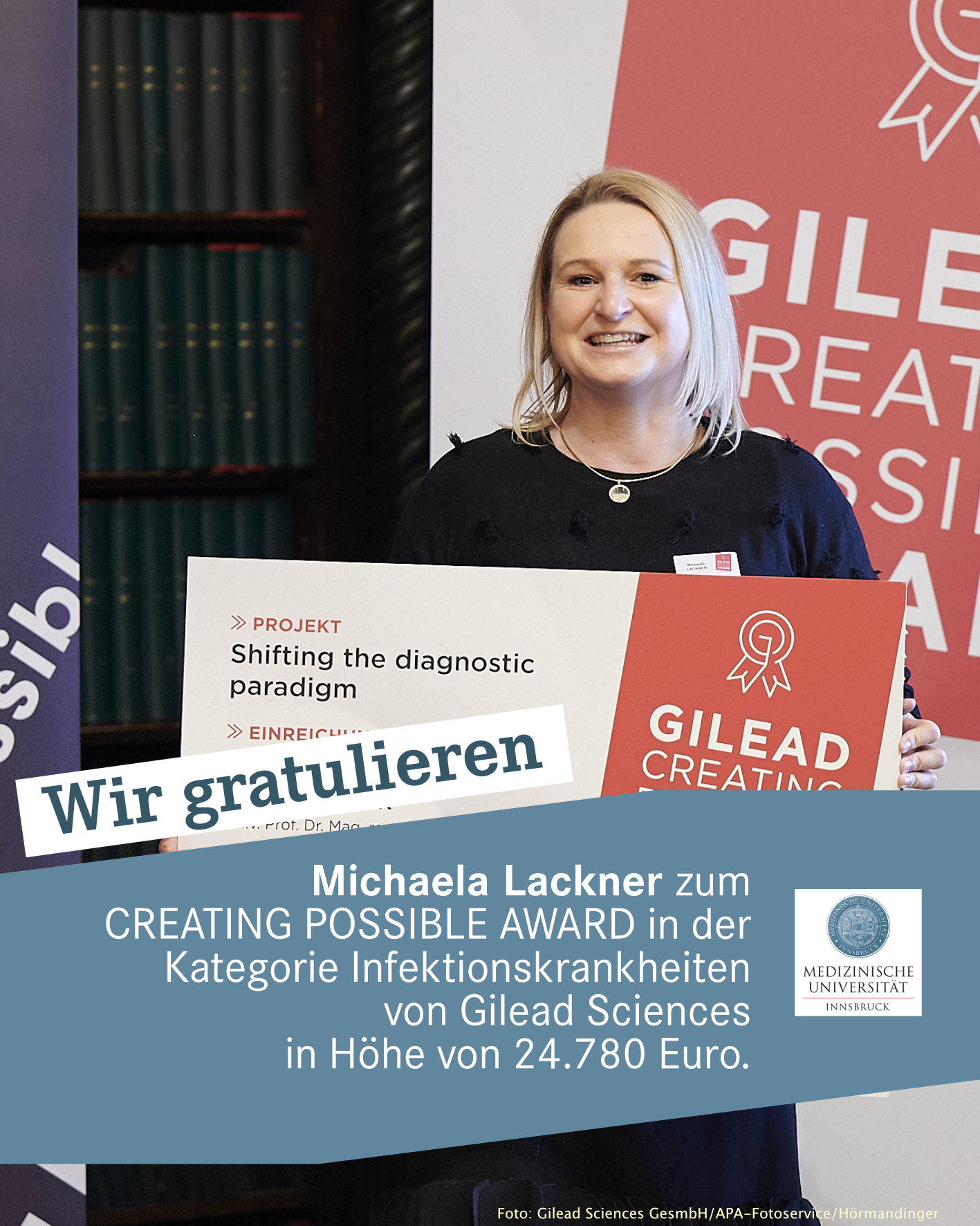 Mit ihrem Projekt „Shifting the diagnostic paradigm“ gehört Michaela Lackner zu den Gewinner:innen des CREATING POSSIBLE AWARD. Am 2. Februar zeichnete das Pharmaunternehmen Gilead Sciences fünf Forschungsprojekte auf dem Gebiet der Infektionskrankheiten aus. Michaela Lackner ist Professorin für Experimentelle Mykologie und leitet die Mykologische Forschungsgruppe in unserem Institut für Hygiene und Medizinische Mikrobiologie.