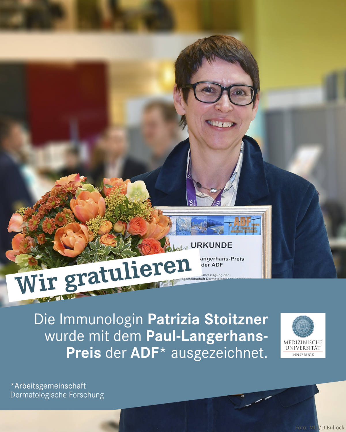 Der Immunologin und Leiterin des Labors für Langerhans Zellforschung an der Med Uni Innsbruck, Patrizia Stoitzner, wurde im Rahmen der Tagung der Arbeitsgemeinschaft Dermatologische Forschung in Innsbruck der Paul-Langerhans-Preis verliehen. Die mit 15.000 Eure dotierte Auszeichnung würdigt herausragende Wissenschafter:innen aus Deutschland, Österreich und der Schweiz, die sich durch eine jahrelange „kontinuierliche, erstklassige und innovative dermatologische Forschungstätigkeit“ etabliert haben. Stoitzner forscht bereits seit vielen Jahren zu unterschiedlichen Subtypen der dendritischen Zellen in der Haut und deren Funktion bei Immunantworten.