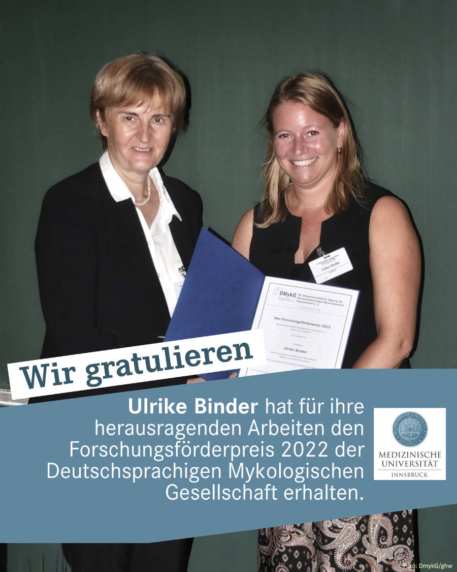 Bei der 56. Jahrestagung der „Deutschsprachigen Mykologischen Gesellschaft“ (DMykG) in Wien wurde Ulrike Binder vom Institut für Hygiene und Medizinische Mikrobiologie für ihre Arbeiten zum Thema „Alternative models to study antifungal susceptibility and virulence of pathogenic molds“ ausgezeichnet. Die Mikrobiologin interessiert sich speziell für die selten vorkommenden, aber mit sehr schwerem Krankheitsverlauf assoziierten Infektionen mit Mucormyzeten. Unter anderem mittels eines alternativen Insektenmodells, beschäftigt sie sich mit der Untersuchung der Pathogenität von Pilzen, der Entstehung von Infektion, und der Wirksamkeit neuer antimykotischer Medikamente.