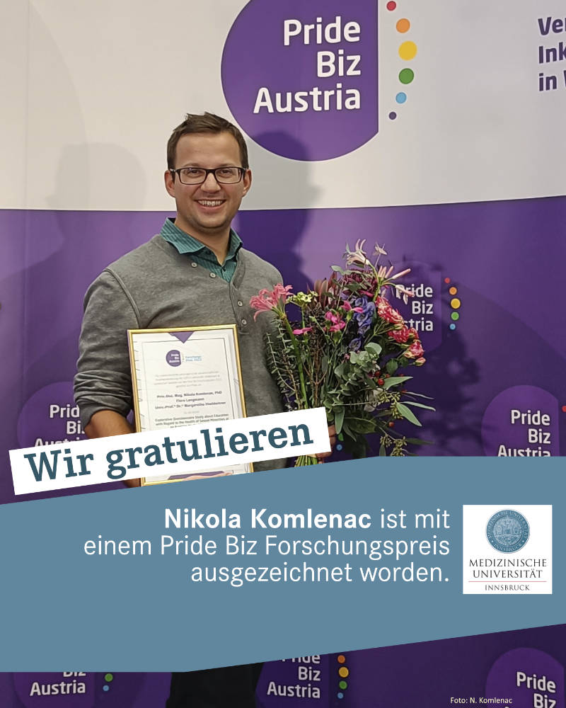 Nikola Komlenac durfte am 16. November in Wien den Pride Biz Forschungspreis gestiftet von Pfizer entgegennehmen. Damit wurde er für seine Studie „Explorative Questionnaire Study about Education with Regard to the Health of Sexual Minorities at an Austrian Medical University“ ausgezeichnet, die im Journal of Homosexuality veröffentlicht worden war.