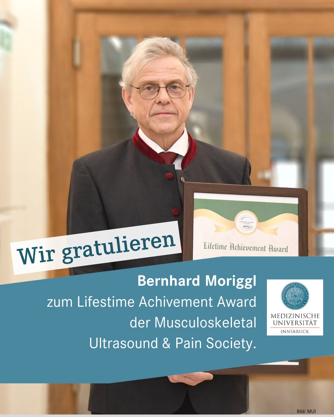 Beim 2nd International MSK Pain Congress, der im Jänner 2024 in Chennai (Indien) stattfand, hat die Musculoskeletal Ultrasound & Pain Society unter der Schirmherrschaft des World Institute of Pain den Lifetime Achivement Award an Bernhard Moriggl verliehen. Moriggl, der am Institut für Klinisch-Funktionelle Anatomie an der Medizinischen Universität Innsbruck tätig ist, erhielt die Auszeichnung für seine Leistungen auf dem Gebiet der Ultraschall-Anwendung in der Schmerzmedizin. Bernhard Moriggl, der sich ab 1986 auf die Ultraschall (US)-Anwendung spezialisiert hat, war 2008 einer der sieben Mitbegründer der Special Interest Group (SIG) US in Pain Medicine der American Society of Regional Anesthesia and Pain Medicine in Toronto. Er blickt auf jahrzehntelange internationale wissenschaftliche Kooperationen mit Kolleg:innen in Dänemark, der Schweiz, Canada, Italien, Deutschland, Schweden und den USA zurück. Moriggl war Mitentwickler der World Academy of Pain Medicine Ultrasonography, deren erster Chair of Scientific Committee sowieI Inaugural Certified Interventional Pain Sonologist (CIPS) examiner. 2021 startete er die aktive Unterstützung der Gulf Pain School (GUP) und der Leicester Pain Education. Er verfasste mehrere Buchbeiträge und zahlreiche wissenschaftliche Arbeiten zum Thema, u.a. Practical Guide RA, the pocket-book RA: Principals and Practical Implementation, beide Ausgaben des Atlas of Ultrasound-Guided Procedures in Interventional Pain Management und ist Co-Autor des iBook Anatomy and Sono-anatomy of US-guided Pain interventions. Ende Juli 2018 folgte Solid Nerve Sonography (Springer Germany, Herausgeber). Die englische Version erschien im April 2019 (Springer International, Editor).