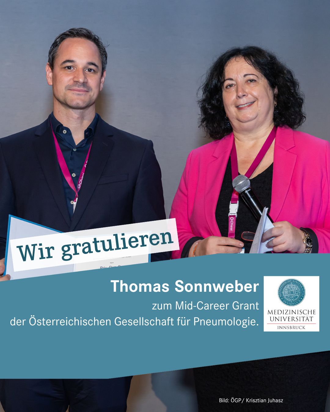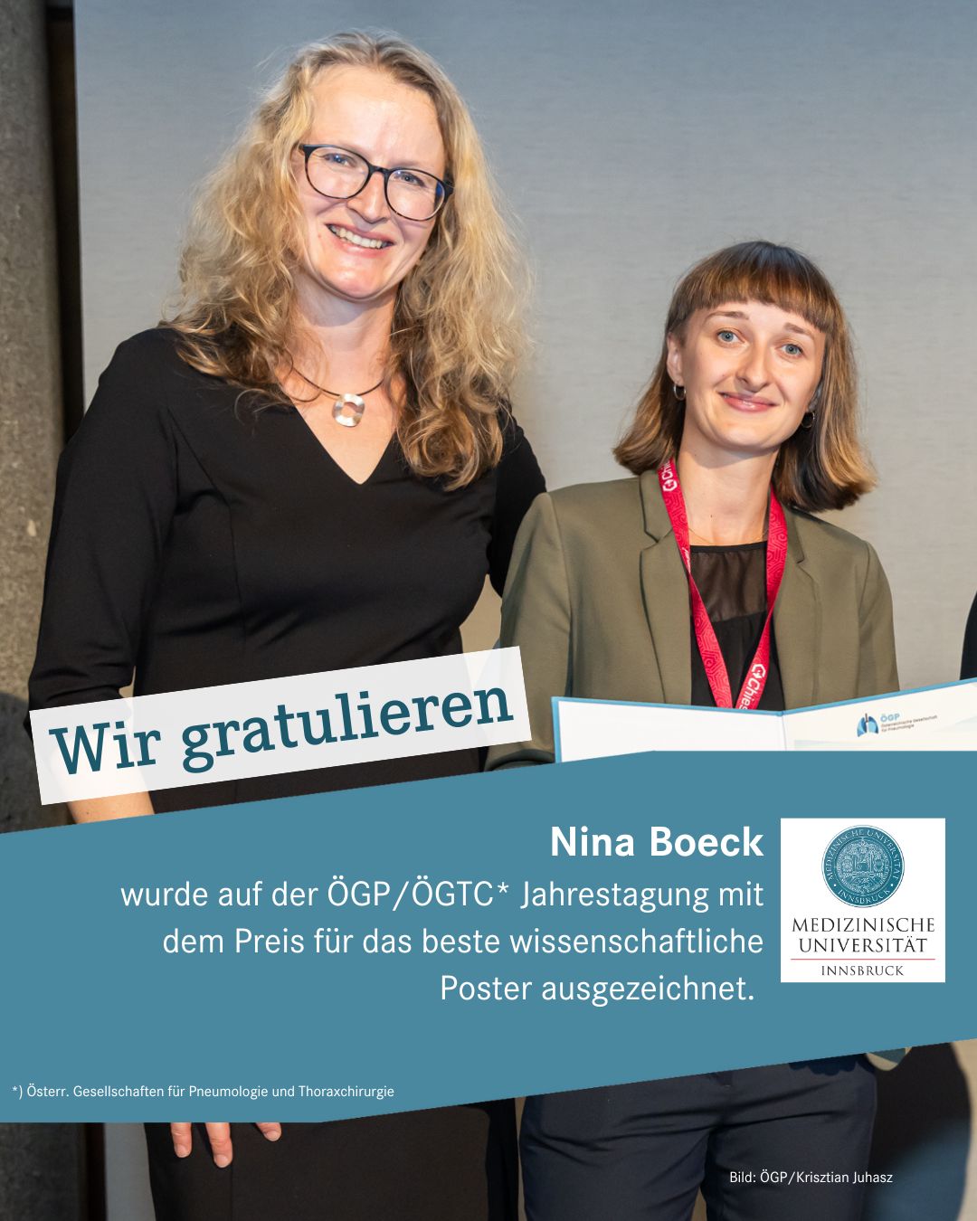 Gleich zwei Preise hat Assistenzärztin Sabina Sahanic von der Univ.-Klinik für Innere Medizin II (Infektiologie, Rheumatologie und Pneumologie) beim heurigen Kongress der Österreichischen Gesellschaft für Pneumologie ÖGP erhalten: Ihr Projekt „Targeting Eosinophilic Inflammation: Utilizing EoL-1 Cell Line to Unravel Key Pathways in Respiratory Diseases“ wurde mit der Wissenschaftsförderung der ÖGP ausgezeichnet. Darin ging es darum, ein In-vitro-Zellkulturmodell zu etablieren, mit dem die komplexe Pathophysiologie von eosinophilen Atemwegserkrankungen untersucht werden kann. Mit dem Geschlechterforschungspreis wurde außerdem eine Arbeit von Sahanic prämiert, in der die genderspezifischen Unterschiede in der Genesung von COVID-19-Erkrankten untersucht wurden. Pneumologin und ÖGP-Generalsekretärin Judith Löffler-Ragg (li.) hat die Auszeichnungen überreicht. Wir gratulieren!