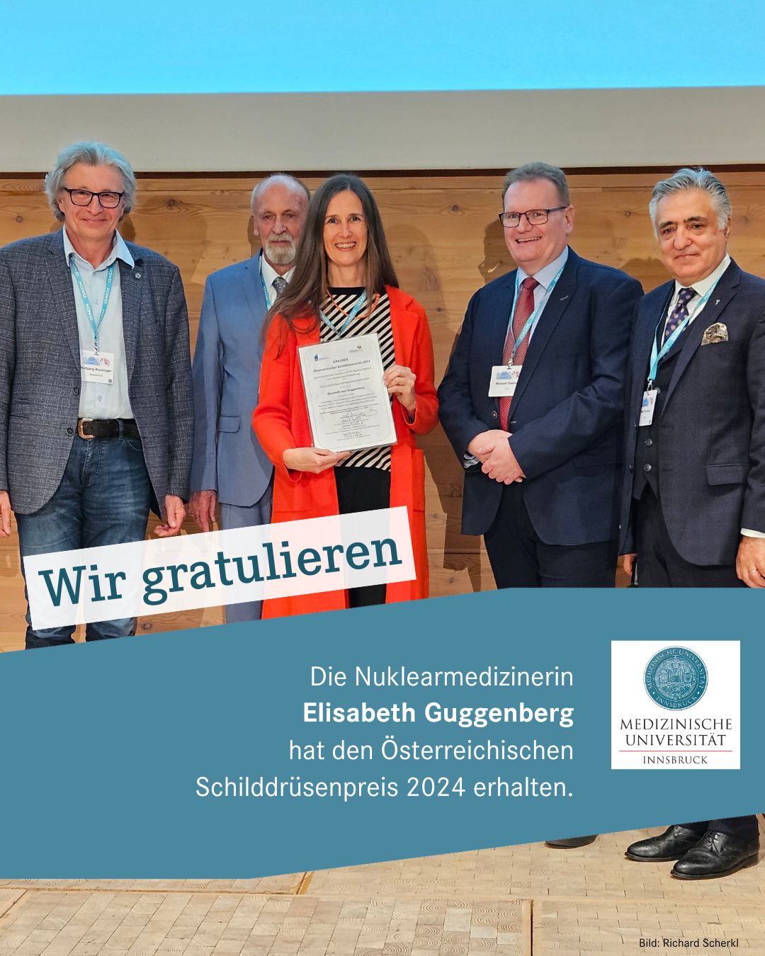 Beim Schilddrüsendialog, der vom 21. bis 23. März in Seefeld über die Bühne ging, verlieh die Österreichische Schilddrüsengesellschaft den Schilddrüsenpreis an Elisabeth Guggenberg von der Univ.-Klinik für Nuklearmedizin. Die prämierte Arbeit zeigt die klinische Anwendung von einem neuen PET-Tracer zur Visualisierung des Cholecystokinin-2 Rezeptors auf, welcher v.a. beim medullärem Schilddrüsenkarzinom, aber auch anderen Tumoren überexprimiert ist. Es handelt sich um ein mit Gallium-68 markiertes Minigastrin-Analogon, das an der Univ.-Klinik für Nuklearmedizin entwickelt wurde und erstmals bei Patient:innen mit medullärem Schilddrüsenkarzinom diagnostisch eingesetzt wurde. Zur Publikation: https://pubmed.ncbi.nlm.nih.gov/36657979/