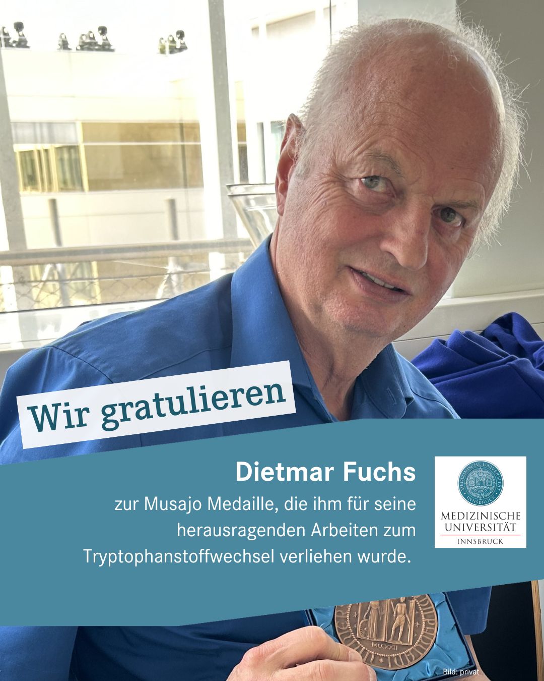 Beim diesjährigen Meeting der International Society for Tryptophan Research (ISTRY) Ende April in Jena wurde Dietmar Fuchs für seine nachhaltigen Forschungsergebnisse auf dem Gebiet der patient:innenbezogenen Immunbiologie und seinen herausragenden Beitrag zum Forschungsfeld rund um den Tryptophanstoffwechsel mit der seit 1995 verliehenen Musajo Medaille ausgezeichnet. Dietmar Fuchs arbeitete über 35 Jahre auf dem Gebiet der Neopterin und Tryptophanforschung. Der analytische Chemiker erforschte den Tryptophan-Stoffwechsel und seine Korrelation mit der Pathologie bei einer Vielzahl von Krankheiten, die von Infektionen, bösartigen und neurologischen Erkrankungen bis hin zu Allergien und Asthma reichen, in enger Zusammenarbeit mit vielen klinischen Wissenschafter:innen in aller Welt. Tryptophan ist eine essentielle Aminosäure, die durch das Immunsystem bei Patient:innen mit Tumoren oder Infektionen vermehrt abgebaut wird, um das Zell- und Keimwachstum zu hemmen. Sie ist aber auch eine Vorstufe des Neurotransmitters Serotonin.