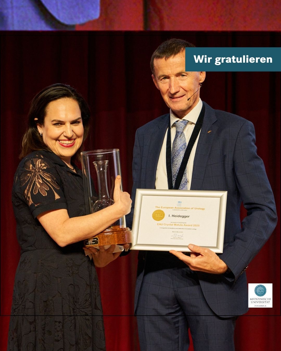 Young Investigator Award für Urologie-Forschung! Nastasiia Artamonova (Univ.-Klinik für Urologie) wurde von der Deutschen Gesellschaft für urologische Forschung mit dem Young Investigator Award für ihre PhD-Arbeit ausgezeichnet. Mit dem Preis ist ein Reisestipendium für das AACR Annual Meeting 2026 in San Diego verbunden. Die Auszeichnung wurde im Rahmen des AUF-Symposiums vergeben, das heuer unter der wissenschaftlichen Co-Leitung von Isabel Heidegger-Pircher (Stellvertretende Direktorin der Univ.-Klinik für Urologie) erstmals in Österreich stattfand.
