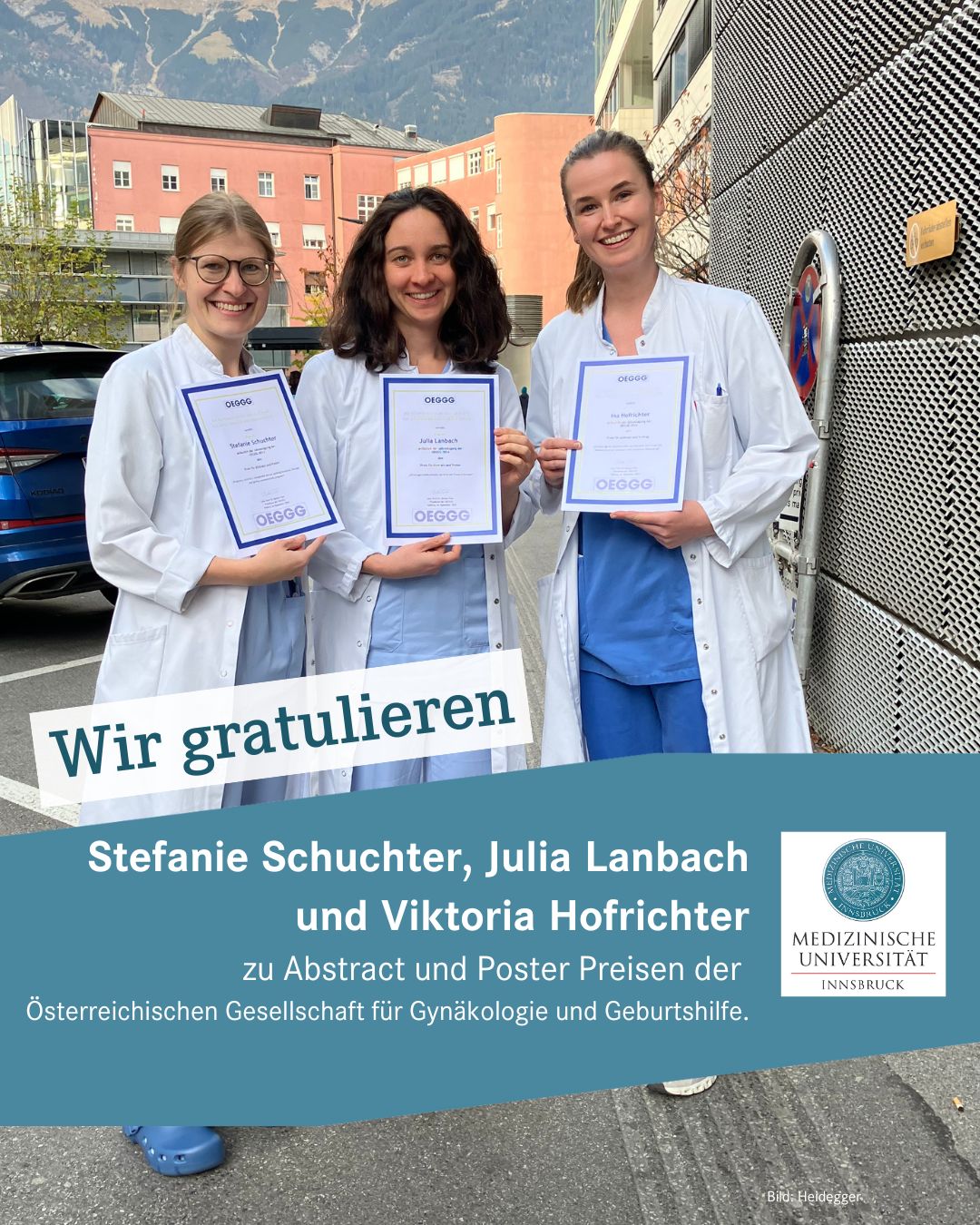 Im Rahmen der 32. Jahrestagung der AGO Austria (Arbeitsgemeinschaft für Gynäkologische Onkologie der österreichischen Gesellschaft für Gynäkologie und Geburtshilfe) in Salzburg wurden zwei junge Forscherinnen der Innsbrucker Univ.-Klinik für Gynökologie und Geburtshilfe (Direktor: Christian Marth) mit Posterpreisen ausgezeichnet. Das Poster „Tumor Mutation Burden beim p53-mutierten Endometriumkarzinom und p53-mutierten serösen high-grade Ovarialkarzinom“ von Katharina Steger wurde als bestes prämiert. In dieser Studie konnte gezeigt werden, dass eine hohe TMB (tumor mutational burden) sowohl beim p53-mutierten Endometriumkarzinom als auch beim p53-mutierten high-grade serösen Ovarialkarzinom mit verbessertem Überleben verbunden ist. Möglicherweise kann selbst eine geringe Präsentation von Neoantigenen beim p53-mutierten Endometriumkarzinom eine Immunreaktion auslösen und damit die Prognose signifikant beeinflussen. Die Prämierung als drittbestes Poster galt der Arbeit von Miriam Emmelheinz, in der gezeigt werden konnte, dass sowohl die Kühlung als auch die Kombination von Kühlung und Kompression an Extremitäten das Auftreten von Polyneuropathie bei Patientinnen mit gynäkologischen Tumoren unter taxanhaltiger Chemotherapie deutlich verminderte; beide Methoden zeigten sich bei den 200 rekrutierten Patientinnen als sicher und nebenwirkungsarm (CROPSI Studie unter der Leitung von Christine Brunner).
