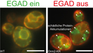 Fluoreszenz-Mikroskopie Bilder von Bäcker-Hefe: in WT (Wild Type) Zellen (EGAD ein) befindet sich Orm2 (grün) nur im Endoplasmatischen Retikulum (ER, rot). Wenn Orm2 das ER verlässt, wird es von EGAD abgebaut. Wenn Orm2 nicht mehr von EGAD abgebaut werden kann (EGAD aus), führt das zur Anhäufung von Orm2 außerhalb des ER und damit zu Schäden an diesen Zellen. (c) MUI/Teis