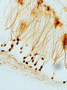 Die Aufnahme zeigt immunhistochemisch gefärbte Nervenzellen im Hippokampus des Gehirns (Tiermodell). Für den neuen gentherapeutischen Ansatz wird hier ein zusätzliches Gen eingeschleust, sodass die Zellen bei Bedarf Dynorphin ausschütten. © Schwarzer/MUI.