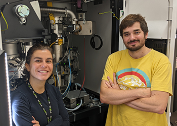 Bild 2: Marta Carroni und Andreas Naschberger vor der cryoEM Anlage im SciLifeLab der University of STockholm (c) Mathieu Coinçon