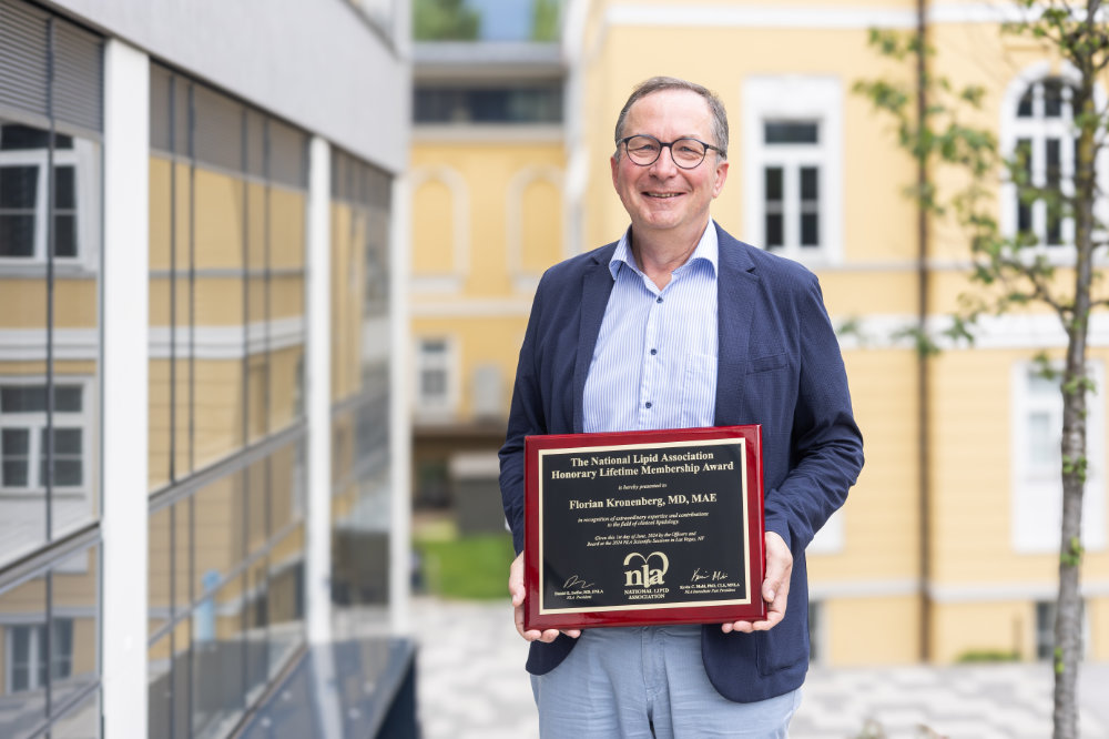 Das Institut für Genetische Epidemiologie in Innsbruck gehört zu den weltweit führenden Einrichtungen für Lp(a)-Forschung. Dieses Renommee ist Direktor Florian Kronenberg zu verdanken, der die Forschung auf diesem Gebiet mit seinen Kolleg:innen in den vergangenen 30 Jahren massiv vorangetrieben hat. Für sein Engagement hat der aus Oberösterreich stammende Mediziner und Wissenschafter zahlreiche Preise und Auszeichnungen erhalten. Zuletzt honorierte ihn im Juni 2024 die einflussreiche US-amerikanische National Lipid Association (NLA) mit der Ehrenmitgliedschaft auf Lebenszeit. In der Liste der Ehrenmitglieder der letzten 15 Jahre finden sich sehr bekannte Vertreter der Lipidforschung. In der Laudatio wurden die wichtigen Beiträge erwähnt, die Kronenberg und sein Team für das Feld geleistet haben. Besonders hervorgehoben wurde das 2022 publizierte Lp(a) Konsensuspaper der European Atherosclerosis Society, für welches Kronenberg den Vorsitz hatte. „Die National Lipid Association hat nun wesentlich durch unser Consensus Paper getriggert deren Richtlinie geändert und ist nun auf Linie mit unseren Empfehlungen“, sagt Kronenberg.