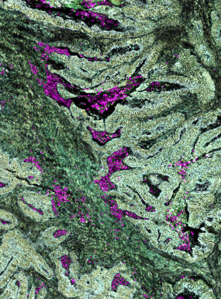 Die Visualisierung von Darmkrebs mittels Spatial Transcriptomics (10X Genomics Xenium Plattform) zeigt eine komplexe Gewebearchitektur mit funktionellen zellulären Nischen, in welchen sich Neutrophile (pink) anhäufen. Foto: Alexander Kirchmair