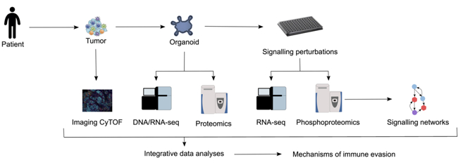 In the past, two key technologies were developed, which allow systematic investigation of the tumour-immune interface: 1) patient-derived tumour organoids that retain cell-cell and cell-matrix interactions, which more closely resemble those of the original tumour in comparison with cells grown in two dimensions on plastic dishes; 2) high-throughput and high-content technologies, including whole exome and RNA sequencing of bulk tissue, single-cell RNA sequencing, mass-spectrometry-based proteomics [3] and multiplexed staining of tissue sections. Moreover, considerable progress has been made in the development of novel computational tools for deep mining of the data. We use these tools (Fig. 1) to investigate the impact of conventional and targeted drugs on T-cell activity, by means of archived samples, patient-derived organoids and systematic perturbation of the involved pathways, and innovative computational tools. Our aim is to classify patients by using multidimensional profiling to analyse samples, and to identify biomarkers of response to immunogenic chemotherapy and consequently patients who would benefit from combination therapy. Genomic, transcriptomic, phosphoproteomic and metabolomic characterisation of the organoids facilitates the generation of key quantitative data and will ultimately lead to identification of effective drugs and drug combinations.