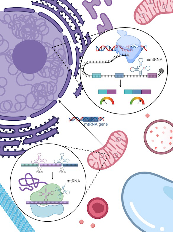The mitochondria of eukaryotic cells contain their own genome, which is derived from a bacterial ancestor and separate from the nuclear genome. During mammalian evolution, parts of the mitochondrial genome were integrated into the nuclear genome, including mitochondrial tRNAs that are partly found within intronic regions of nuclear genes. We investigate the processing and function of nuclear intronic mitochondrial-derived tRNAs (nimtRNAs) and their intergenic counterparts, as well as the mechanisms associated with these (Fig. 2).