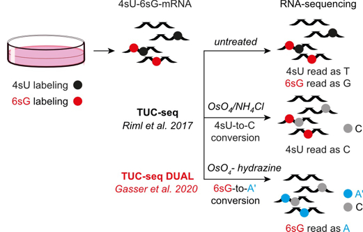 Fig. 6: Basic concept of TUC-seq and TUC-seq DUAL. RNA expression dynamics can be studied by means of metabolic labelling of nascent RNAs with 4sU and/or 6sG. The quantification of newly synthesised versus existing RNA is achieved by means of chemical conversion treatment of the isolated RNA followed by deep sequencing. RNAs that contain the labelling nucleotide are detected from the presence of U-to-C (in case of 4sU) and G-to-A (in case of 6sG) mutations (Gasser et al. Angew. Chem. Int. Ed. 2020).
