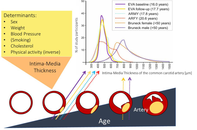 EVA4YOU is a study that builds on the existing knowledge gained from the EVA study. It aims to improve vascular health of 15/16-year-old Tyrolean pupils and apprentices and to elucidate mechanisms of early vascular ageing (Fig. 3). The current database concerning the influence of prematurity, neonatal growth characteristics and feeding practices on early vascular ageing will be extended and associations with additional risk markers for cardiovascular diseases will be elucidated.