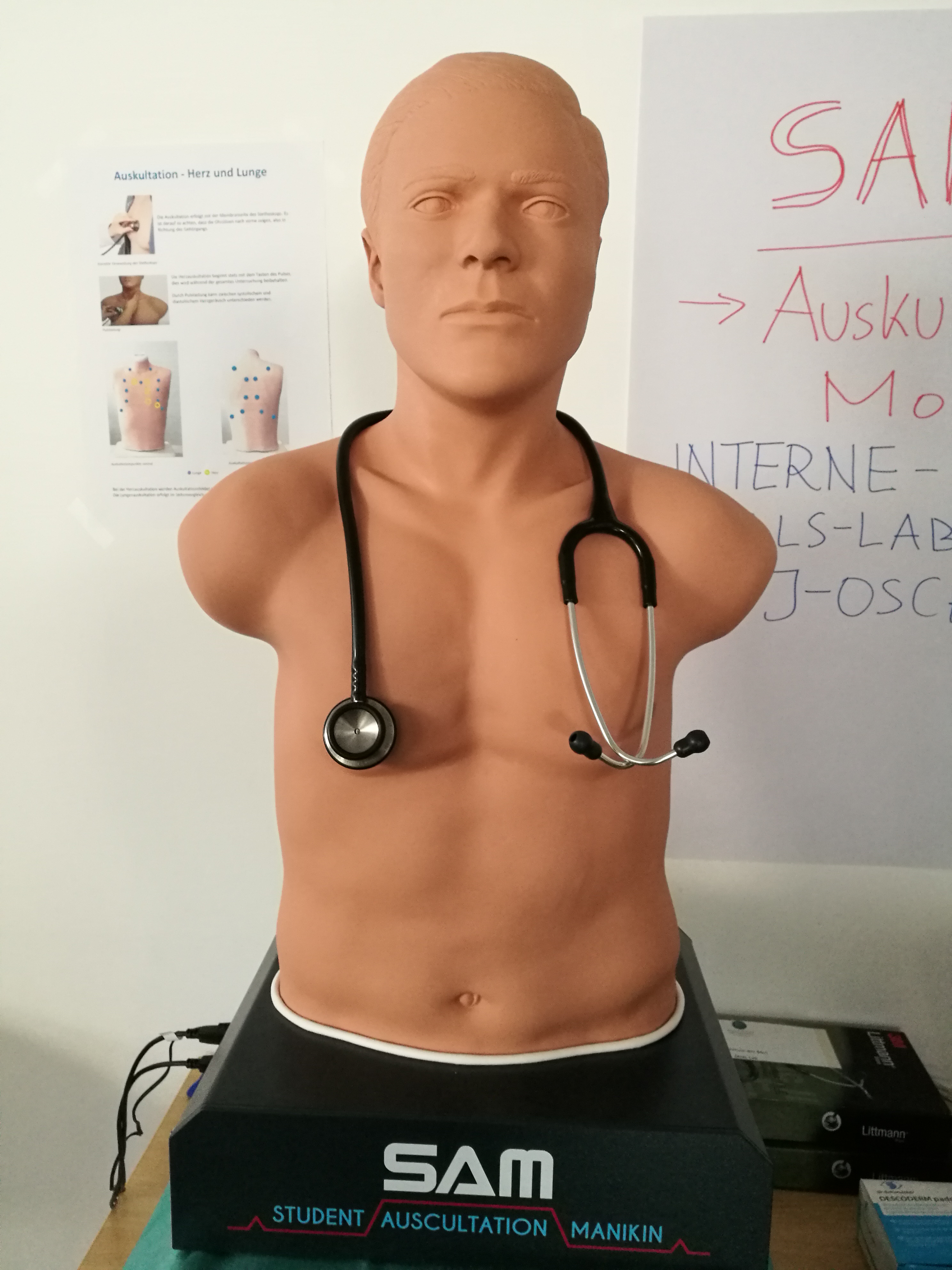 - Üben des Vorgehens bei der Abklärung von typischen internistischen Patient:innenfällen anhand strukturierter Übungsfälle inkl. typischer Befunde am Auskultationssimulator SAM2 (sowie ggf. EKG und Labor) als Vorbereitung aufs KPJ bzw. den KPJ-OSCE; klassische internistische Diagnosen, wie sie im Praktikum Innere Medizin vermittelt werden; KEIN Unterricht am Krankenbett oder mit Patient:innen