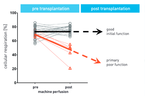 We observed that changes in cell respiration during machine perfusion are correlated with impaired organ function after transplantation. Thus, liver biopsies are analyzed with a high-resolution respirometer, a device developed by oroboros in Innsbruck. The Innsbruck-based company offers unique experience within this field, and the application of this technology allows to predict organ functionality after transplantation.