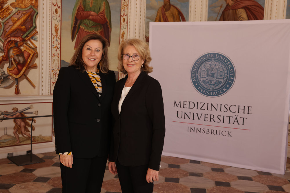 BU: v.l.: Laudatorin und Uniratsvorsitzende Elisabeth Zanon mit Marina Baldauf, ehrenamtliche Vorsitzende Tiroler Hospiz-Gemeinschaft. (c)MedUniIBK/F.Lechner