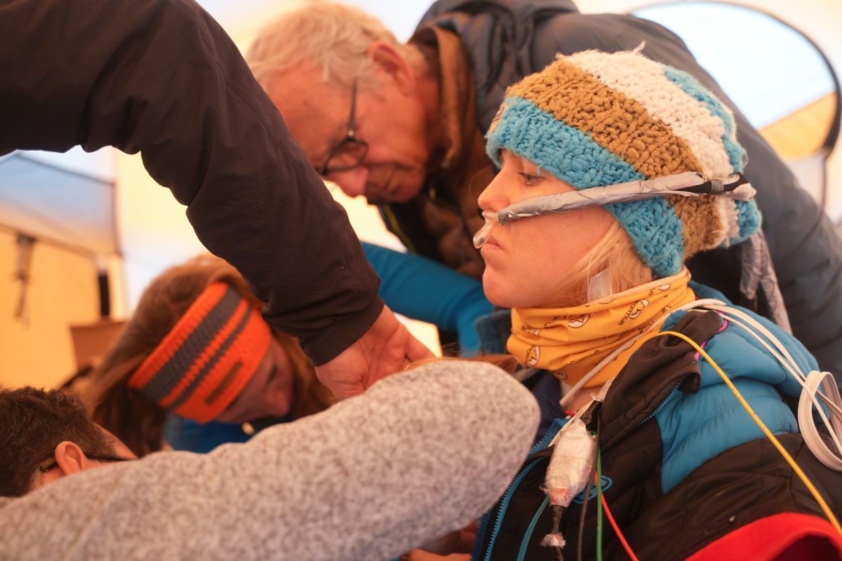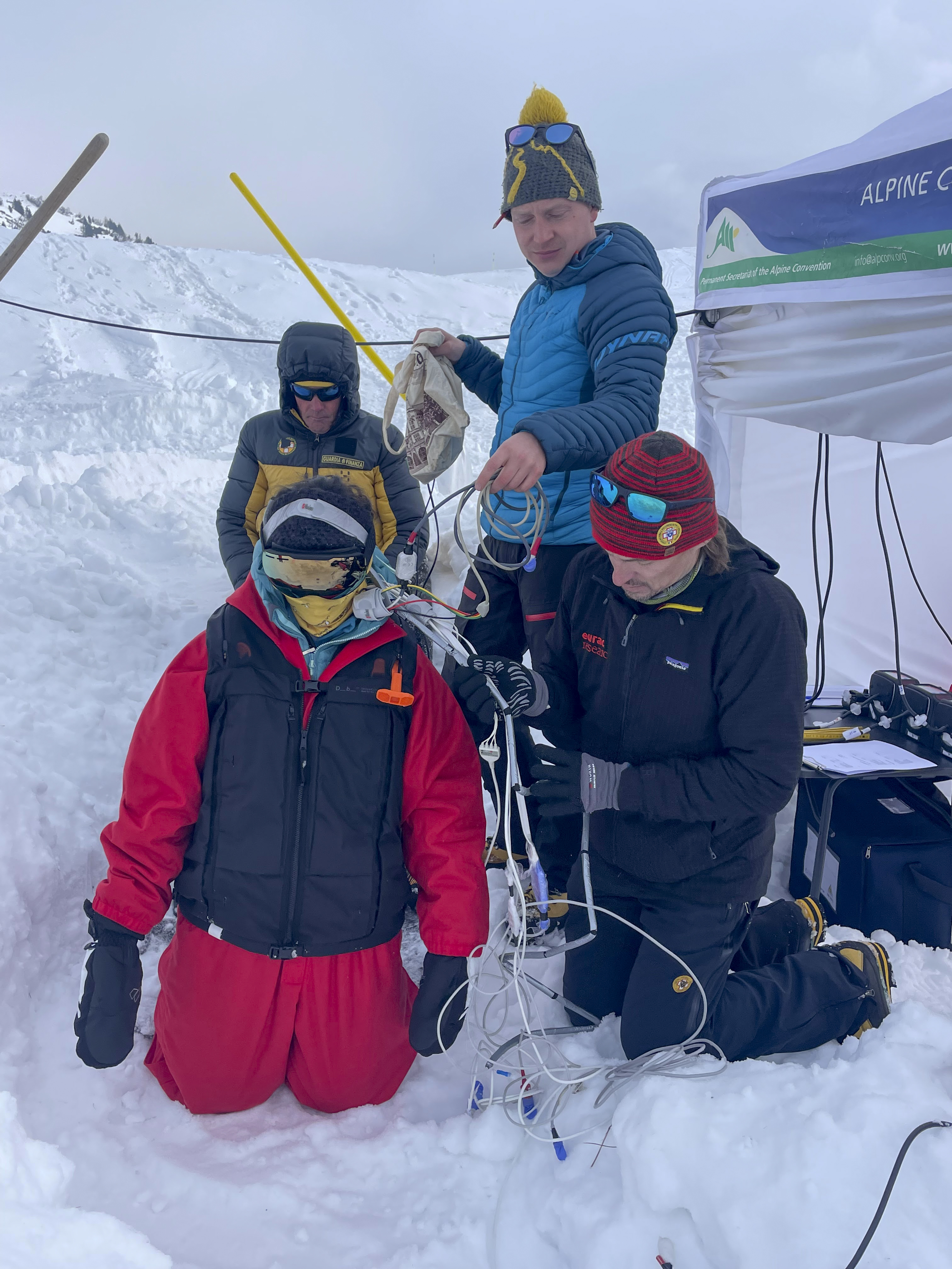 Die Teilnehmerin wird für die Tests unter dem Schnee vorbereitet. (Copyright: Eurac Research/Marina Baldo)