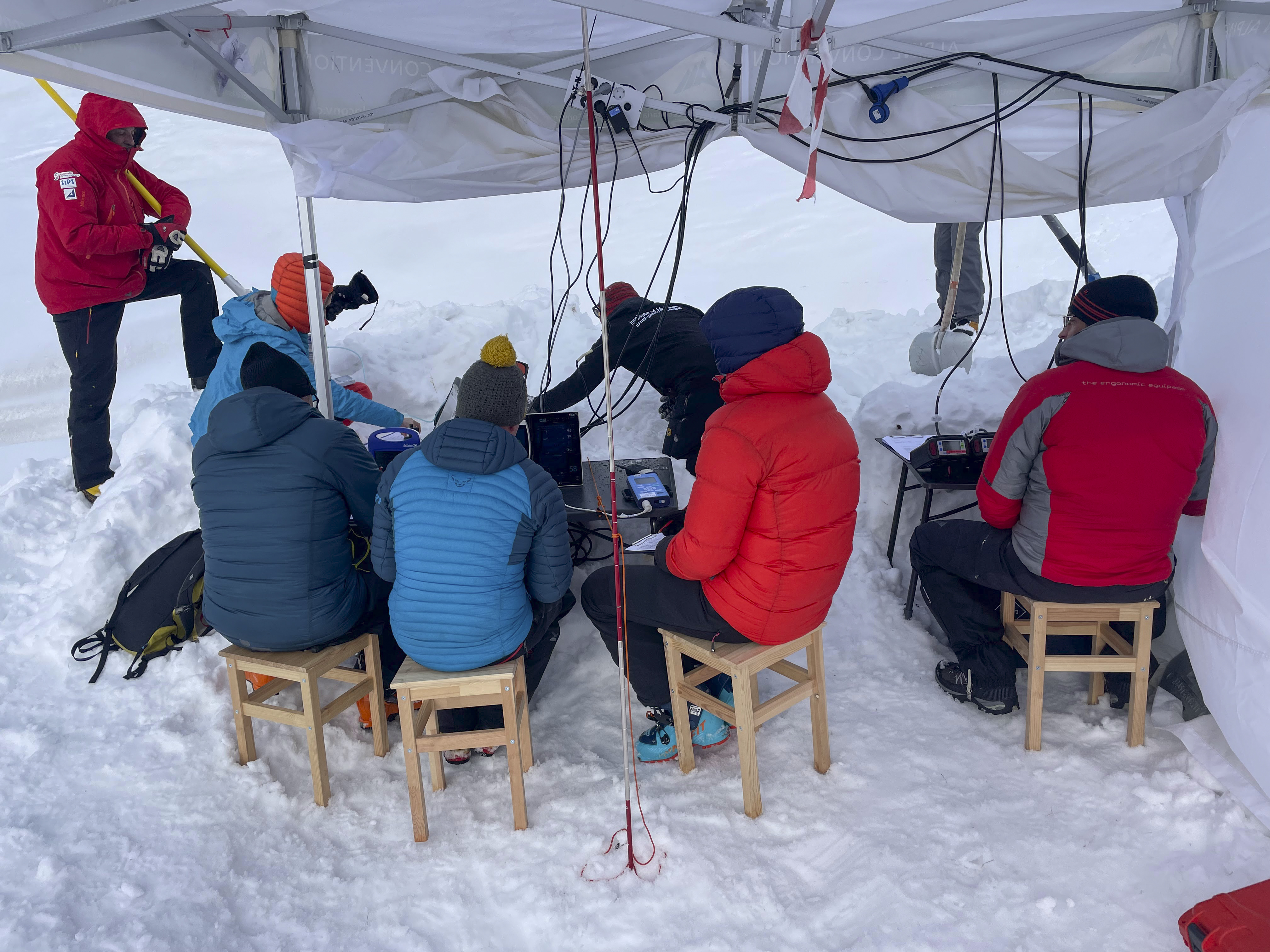 Das Forschungsteam ist in ständigem Funkkontakt mit der im Schnee eingegrabenen Person. (Copyright: Eurac Research/Marina Baldo)