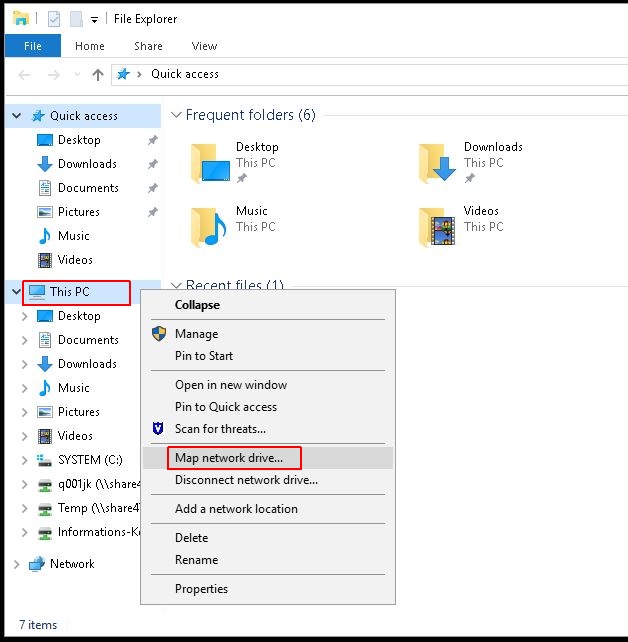 In the left-hand pane right click 'This PC' and select 'Map network drive': See screenshot -